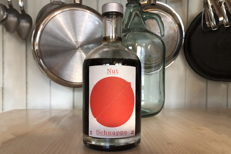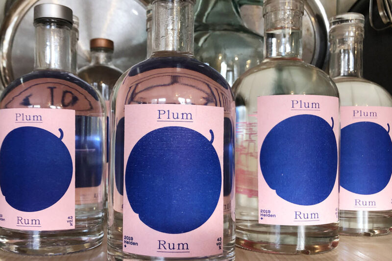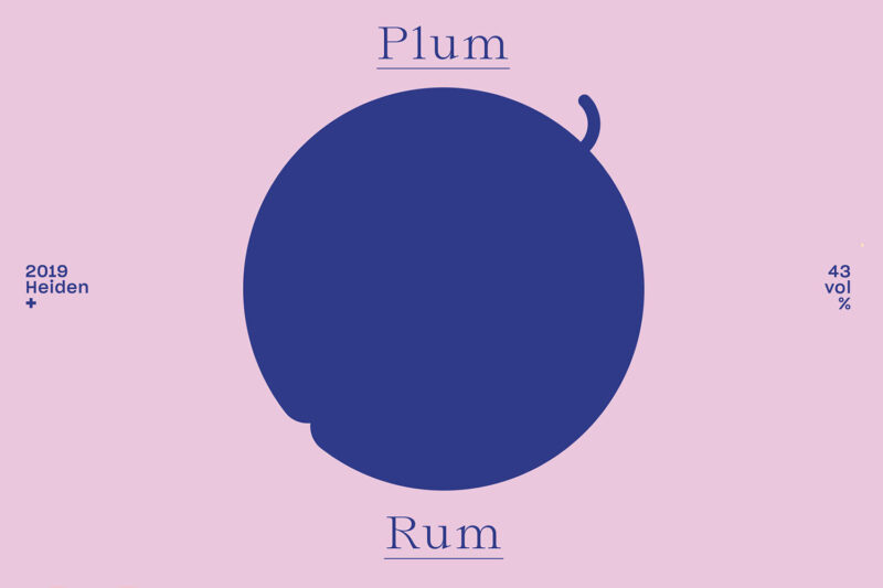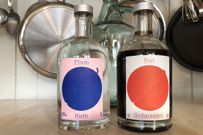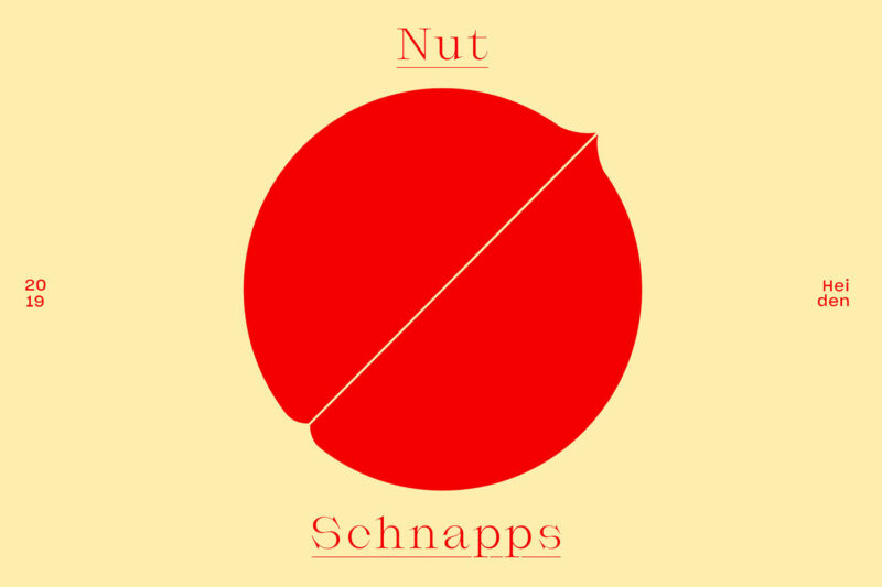 Medium und Produktion: Etiketten für eine limitierte Auflage Pflaumenschnaps und Nusslikör. Einfarbige Risografien auf Farbpapier.