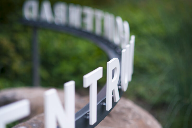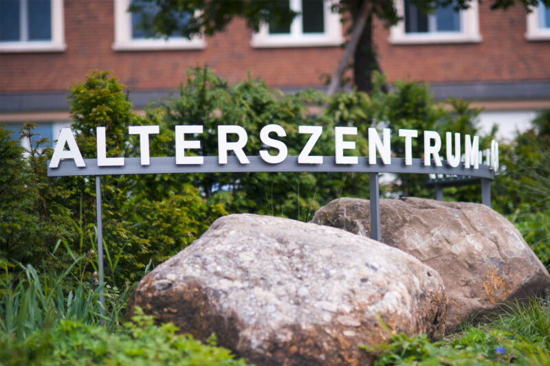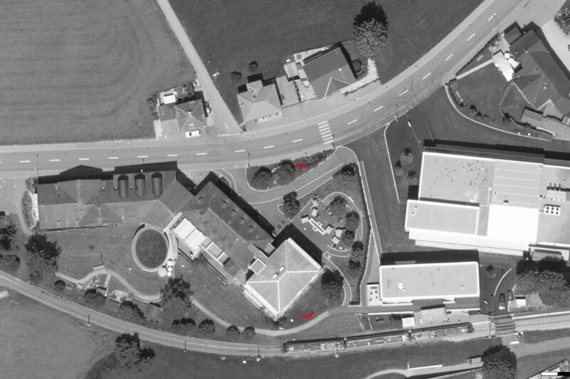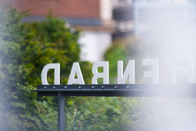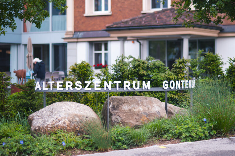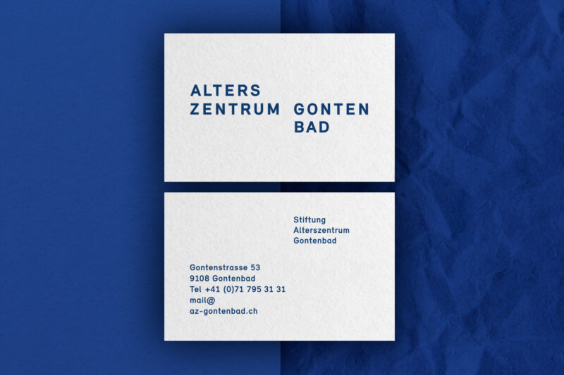 Die Gebäudebeschriftung auf dem Kreissegment reagiert auf die Biegung der Kantonsstrasse. Aus Richtung Appenzell ist zuerst das Wort «Alterszentrum» lesbar, aus der Gegenrichtung das Wort «Gontenbad». Durch diesen Ablauf werden die beiden Begriffe nacheinander lesbar.