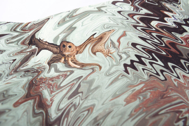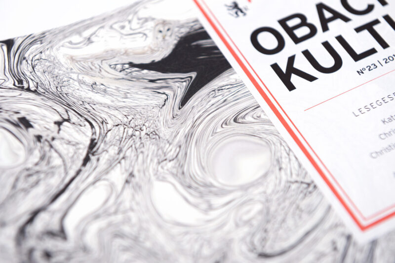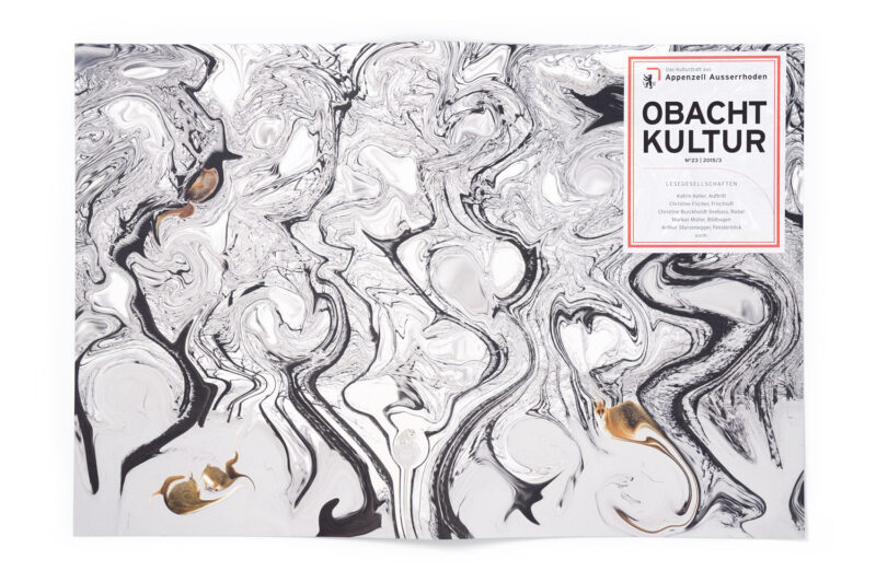 Obacht Kultur Nr. 23 thematisiert die hiesigen Lesegesellschaften. Inspiriert von den vorwiegend im 18. Jahrhundert verbreiteten, von Hand marmorierten Bucheinbänden und Einsatzblättern, entstand eine zeitgemässe Interpretation für den Heftumschlag. Im Gegensatz zu den traditionellen Marmorpapieren, deren Muster mithilfe eines Farbbades erzeugt wird, wurden hier atmosphärisch aufgeladene Waldfotografien digital bearbeitet.