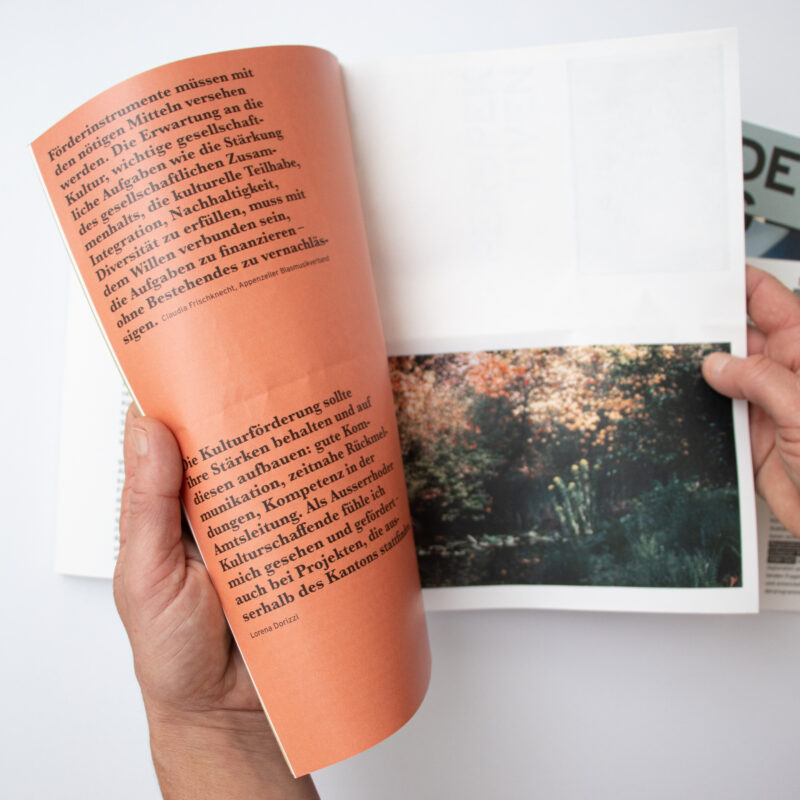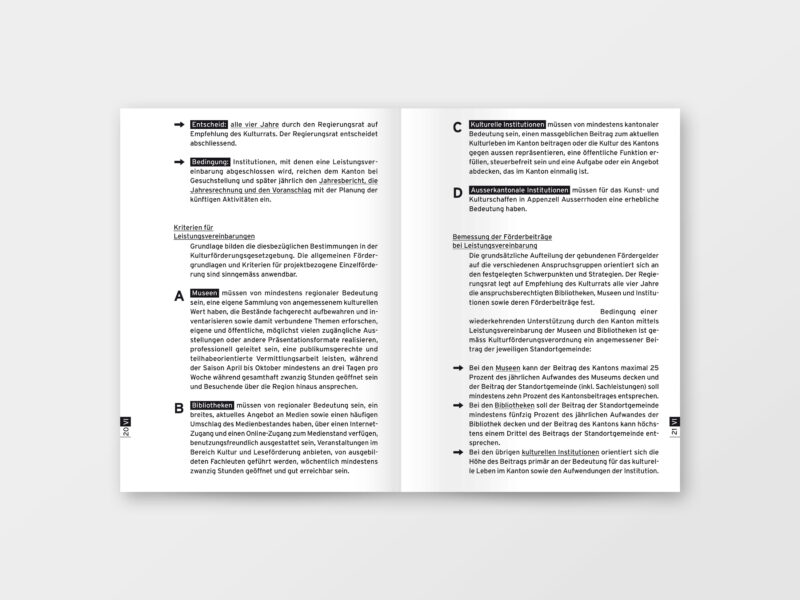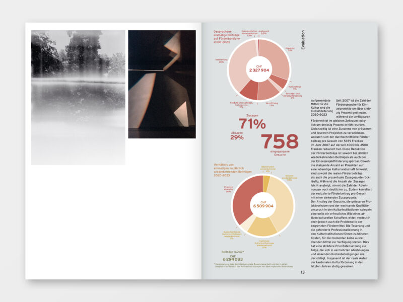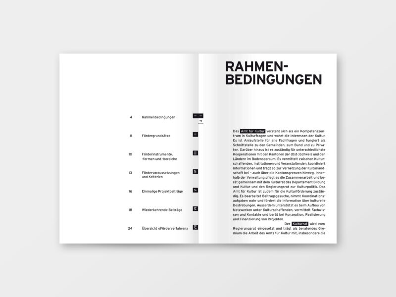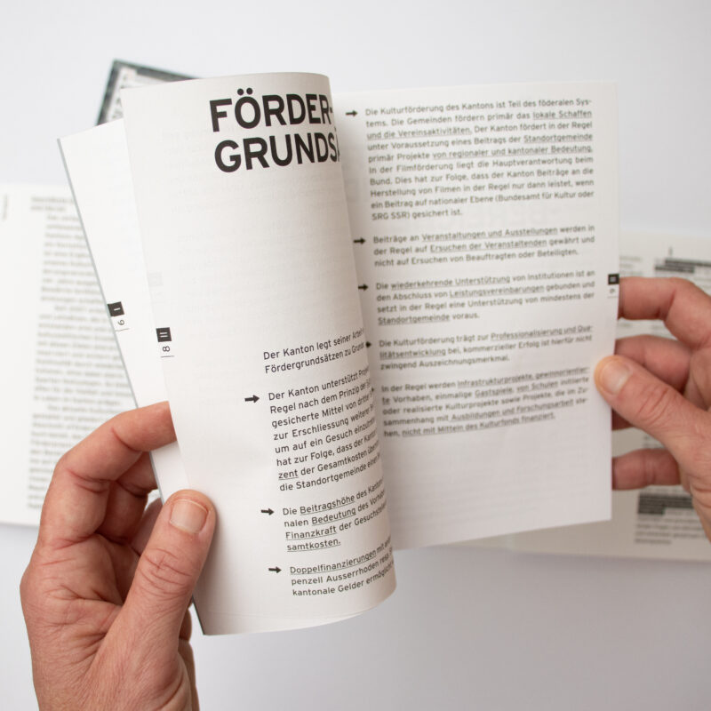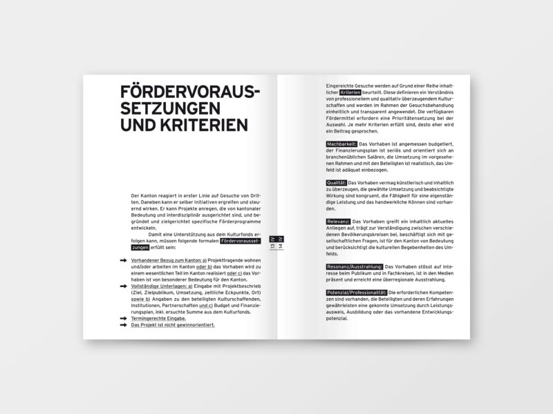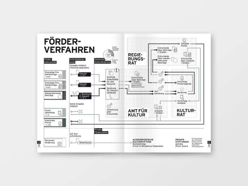 Gestaltung: Der Aufbau entspricht den Bedürfnissen der Zielgruppe und den verschiedenen Ansprüchen an die Aktualität der Publikationsteile: die Hülle umfasst allgemeine Inhalte wie Vorwort, Leitsätze, Glossar; das Handbuch ist ein Nachschlagewerk zum Förderwesen und enthält eine Infografik die das komplexe Förderverfahren übersichtlich aufzeigt; das Magazin mit kurzlebigerem Charakter zeigt den aktuellen Rückblick und mit persönlichen Perspektiven verschiedene Akteure zu Wort – und Bild – kommen.