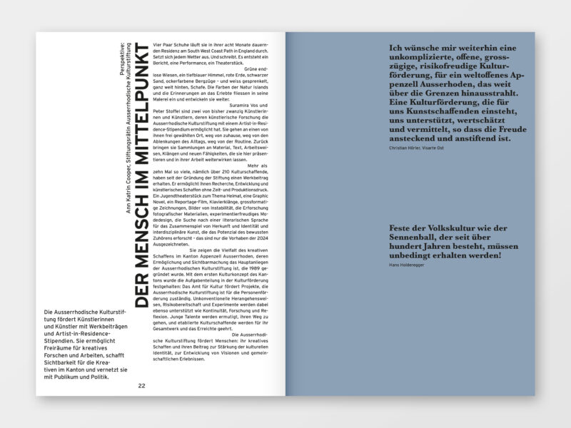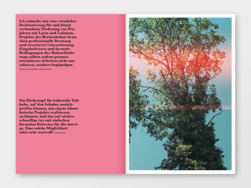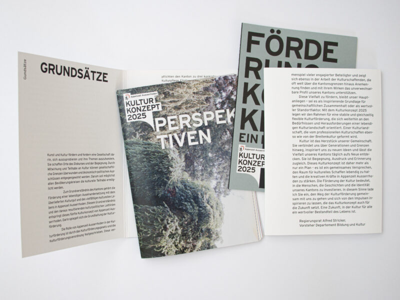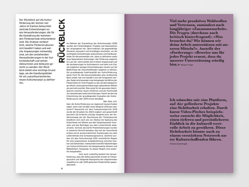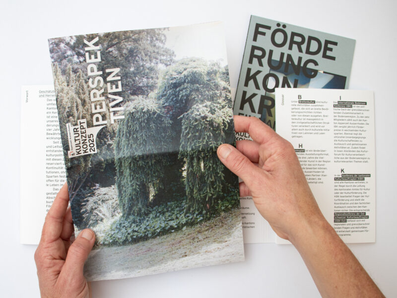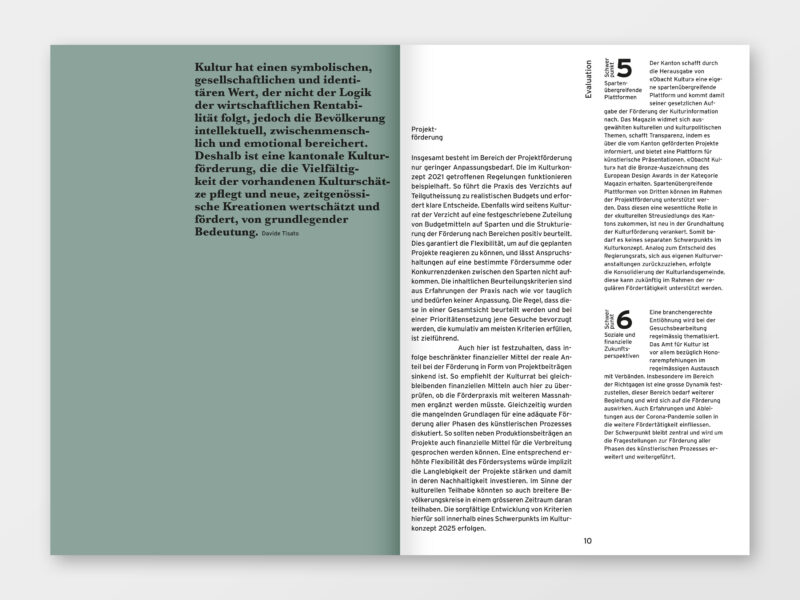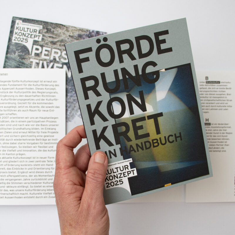 Gestaltung: Der Aufbau entspricht den Bedürfnissen der Zielgruppe und den verschiedenen Ansprüchen an die Aktualität der Publikationsteile: die Hülle umfasst allgemeine Inhalte wie Vorwort, Leitsätze, Glossar; das Handbuch ist ein Nachschlagewerk zum Förderwesen und enthält eine Infografik die das komplexe Förderverfahren übersichtlich aufzeigt; das Magazin mit kurzlebigerem Charakter zeigt den aktuellen Rückblick und mit persönlichen Perspektiven verschiedene Akteure zu Wort – und Bild – kommen.