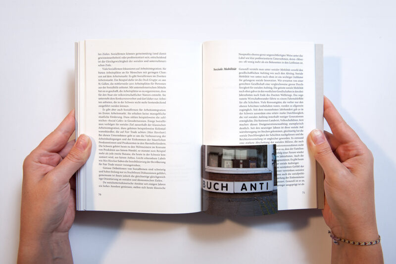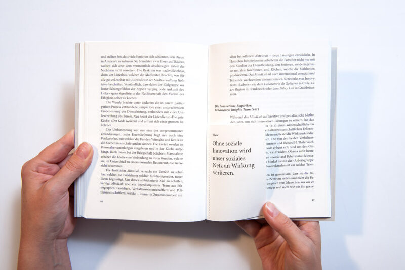 Das Buch besteht sowohl inhaltlich wie auch gestalterisch aus zwei Teilen: den verschiedenen Autorenbeiträgen und den lexialisch anmutenden Grundbegriffen der sozialen Innovation. In diesen Ablauf eingestreut sind kleine, perforierte Seiten, welche abwechselnd zum Thema entstandene Fotografien und Thesen zeigen.