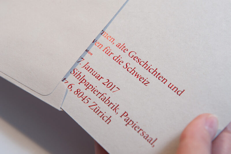 Eine festliche Heissfolienprägung ergänzt die natürlichen Haptik des Umschlagspapiers. Mit dem gleichen Materialkontrast wurde auch eine Einladungskarte umgesetzt.