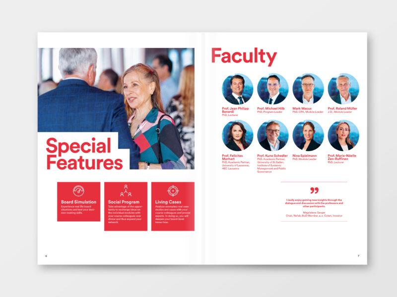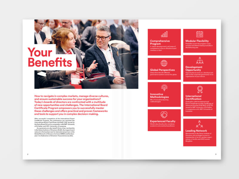Konzept/Gestaltung: Das identitätsstiftende typografische Konzept berücksichtigt genügend Weissraum, die klare Blickführung macht einen wohltuenden Unterschied zu Konkurrenzanbietern und platziert die Angebote der Stiftung im Bildungsbereich. Informationen, USPs und Kundennutzen werden einfach und übersichtlich mit einer ergänzend infografikähnlichen Gestaltung inszeniert.