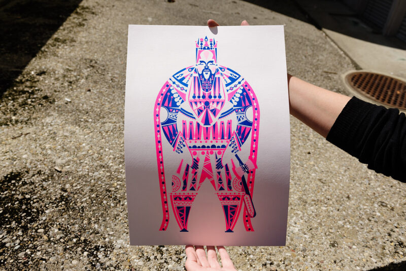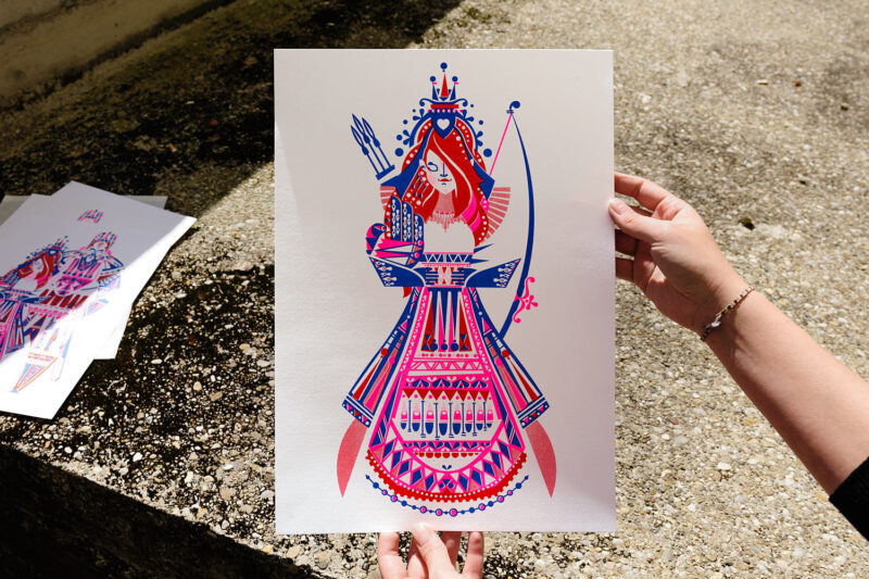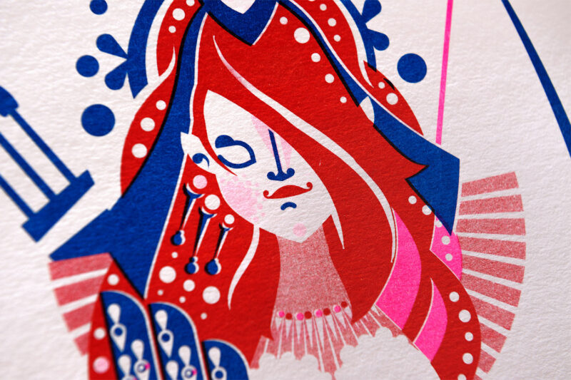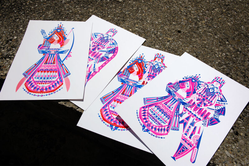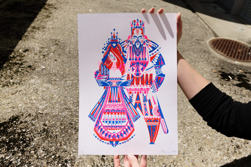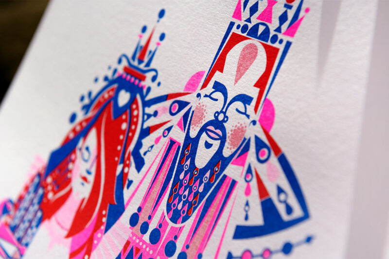 Umsetzung des Hochzeitpaares als dreifarbige Risografie in kleiner Auflage. Verspielte kleinteilige Muster und der reduzierte geometrische Grundaufbau der Figuren stehen in Kontrast.