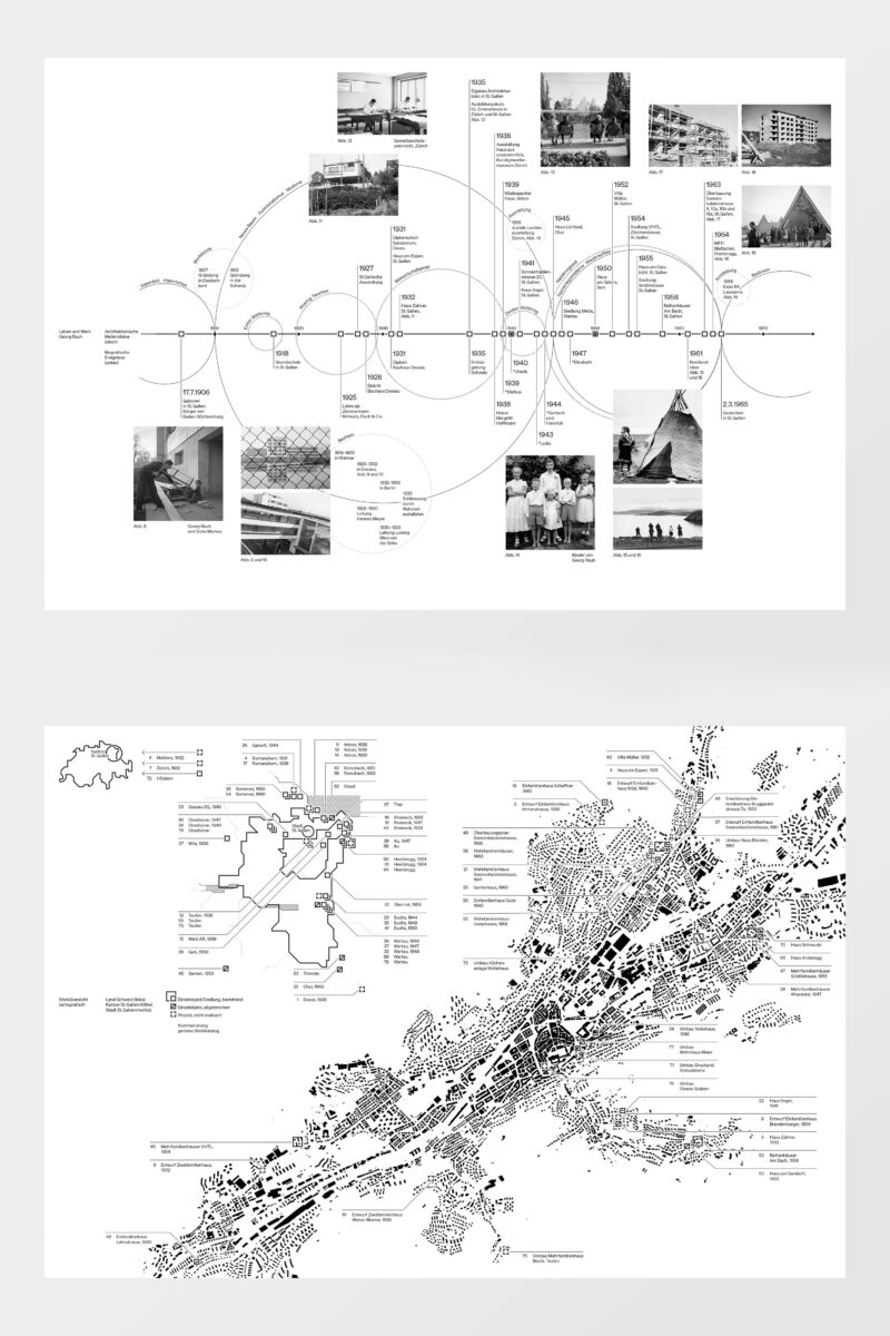 Gestaltung: Der Buchteil «Biografie» enthält eine grafischen Timeline, welche Rauhs Leben übersichtlich in einen grösseren historischen Kontext setzt. Eine kartografische Übersicht bereichert den chronologischen Werkkatalog. Die angewandten grafischen Prinzipien wiederspiegeln den Chakter des Architekten.