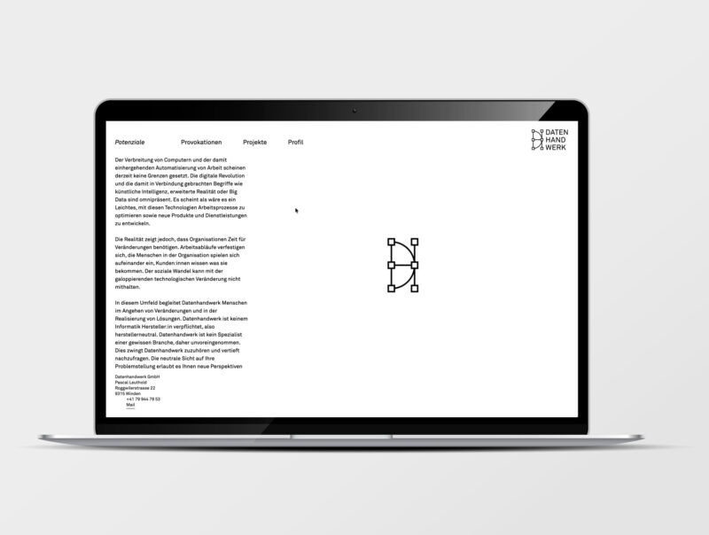 Indem sich das Zeichen auf der Visitenkarten-Website innerhalb eines modularen Systems stetig verändert, wird die Wandlungsfähigkeit der Arbeitsprozesse aufgezeigt.