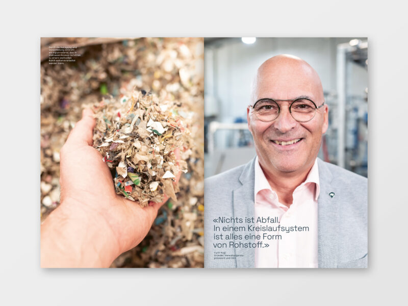 Grosszügige Bildstrecken mit Zitaten ermöglichen einen emotionalen Ein- und Ausstieg und veranschaulichen den unternehmensinternen Recyclingprozess. Für ein optimales Druckbild sind sie auf matt gestrichenem Papier umgesetzt.