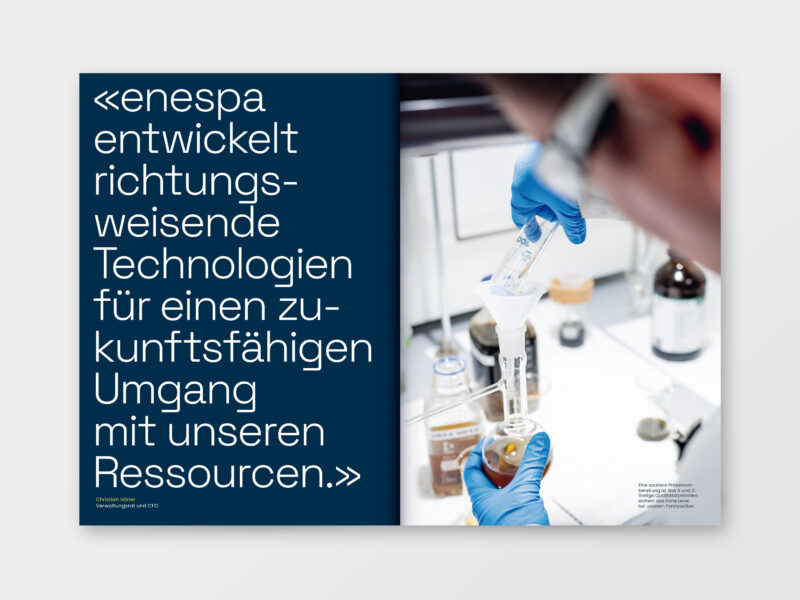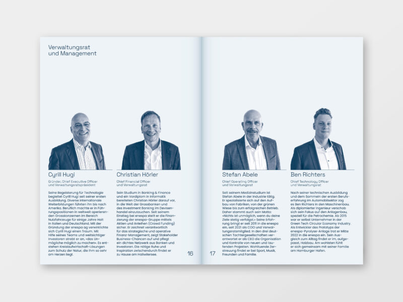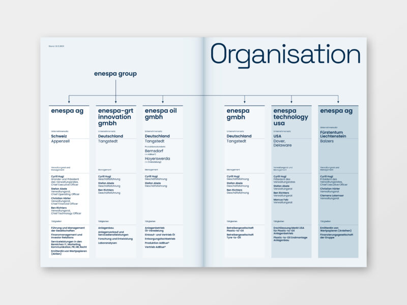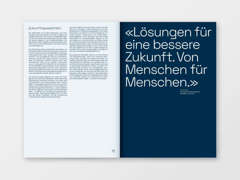 Das Inhaltslayout ist auf einem weiteren Recycling-Papier gedruckt und erhält durch grosszügige Titel- und Zitatseiten eine klare, abwechslungsreiche Struktur. Ergänzend wurden Layouts für Organigramme, Tabellen sowie die Vorstellung des Verwaltungsrats entwickelt.