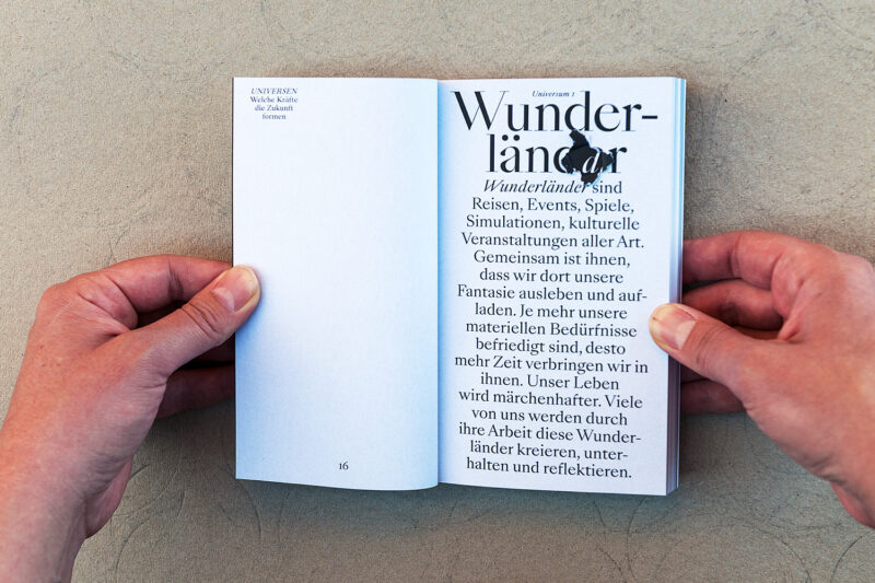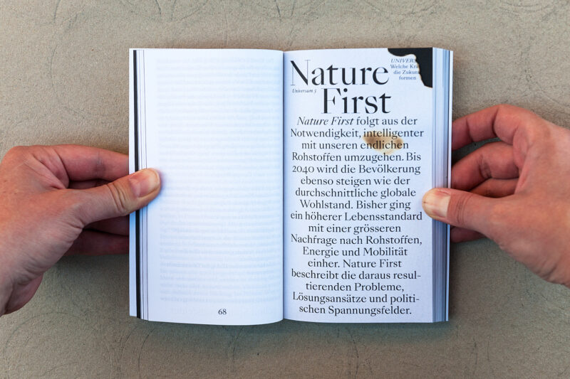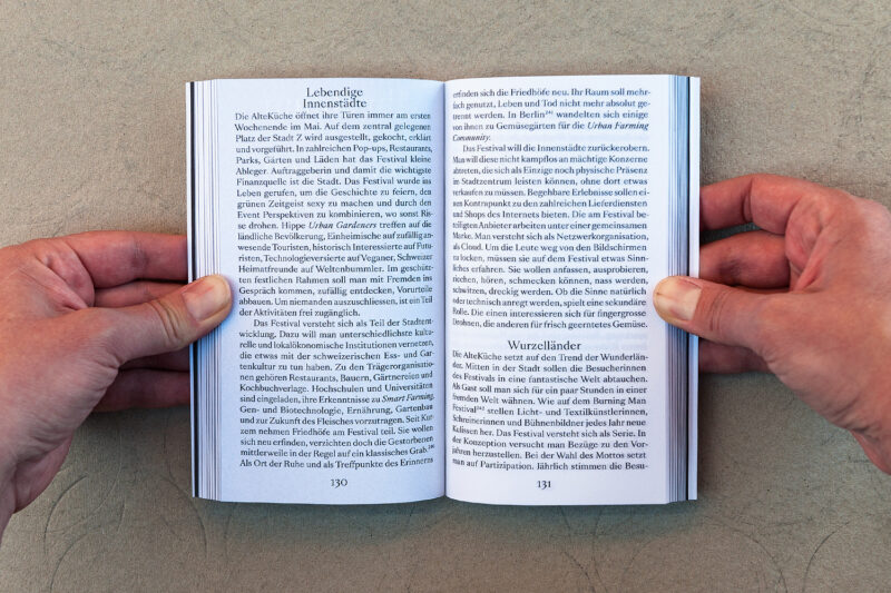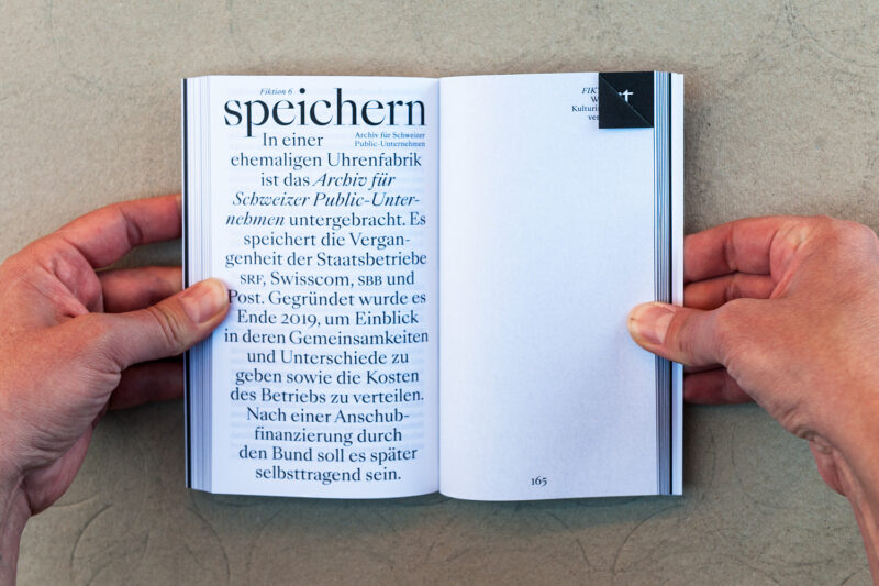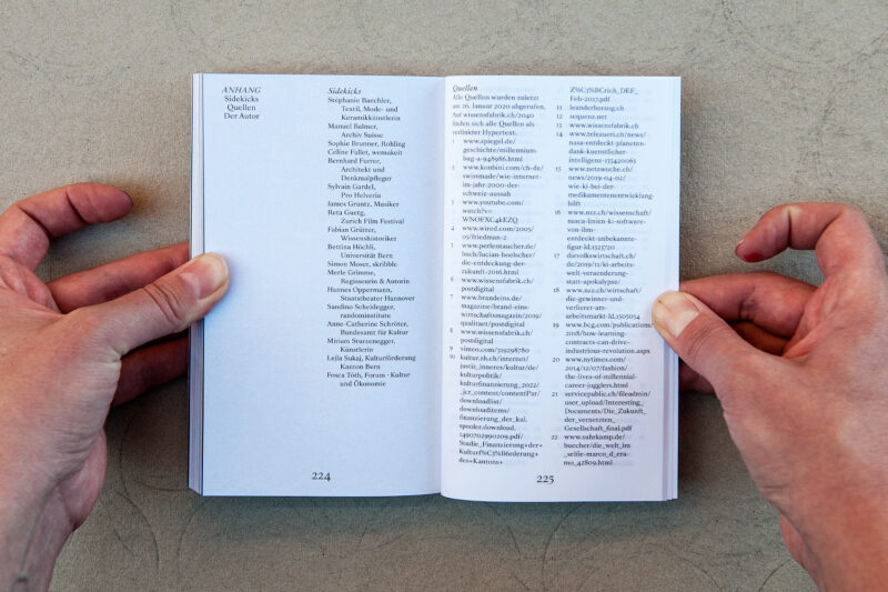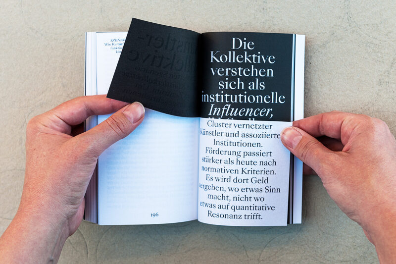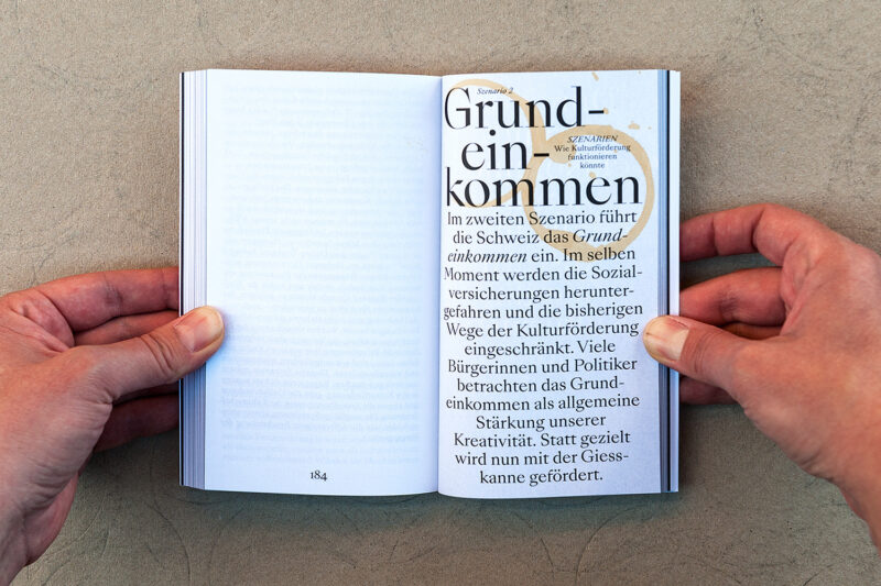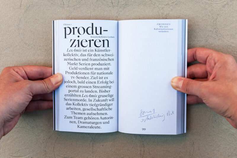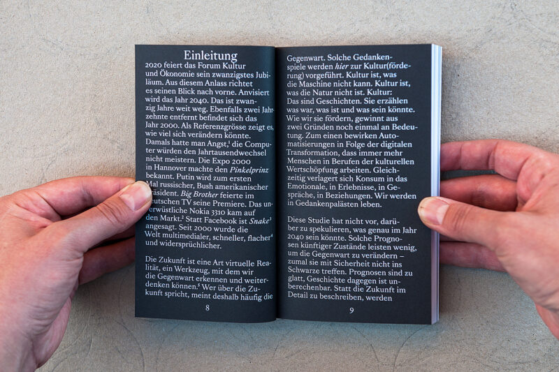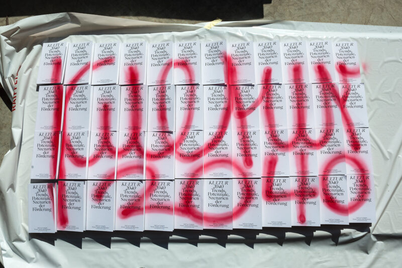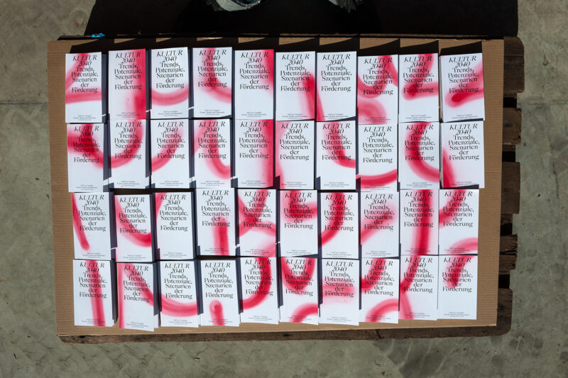 Jeder Umschlag trägt zudem eine individuelle Farbmarkierung – ein Ausschnitt aus dem Schriftzug «Kultur 2040» der jeweils über 48 nebeneinandergelegte Bücher gesprayt wurde.