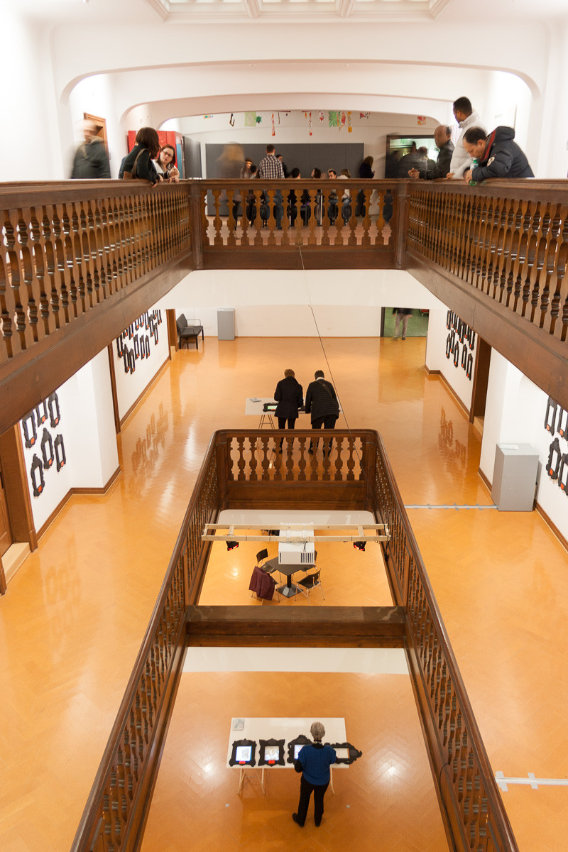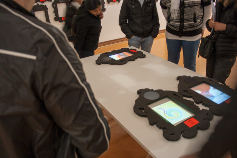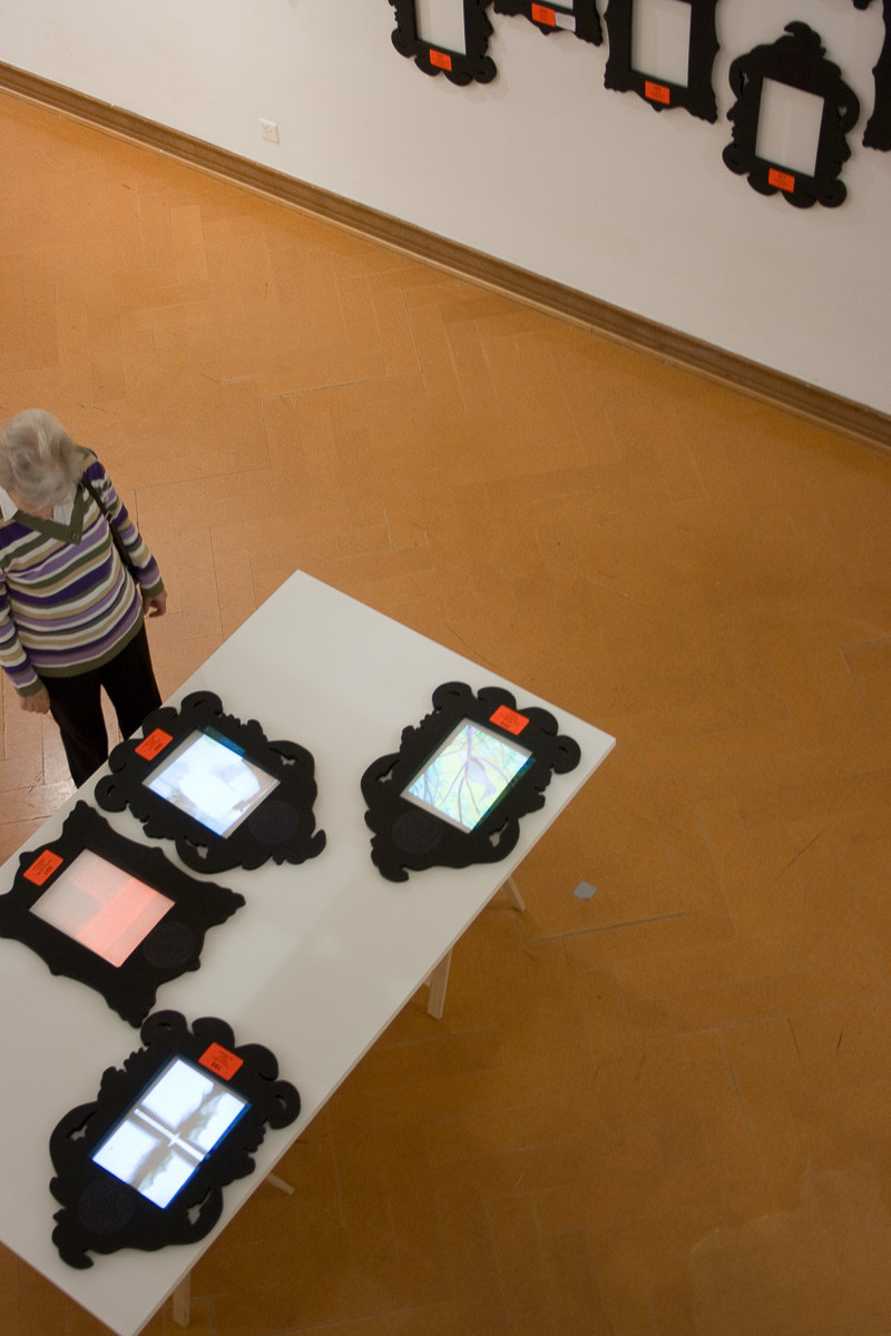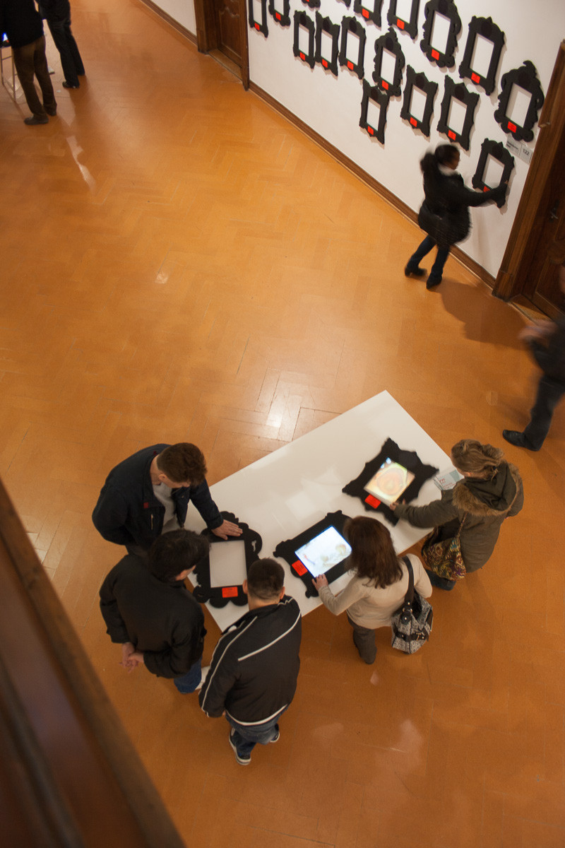 Leere Bilderrahmen an der Wand sind mit Name, Ort und Nummer des Kunstschaffenden versehen. Besucher können eine Auswahl von Rahmen auf einen von drei Tischen legen. Hier werden die Werke jetzt in den Rahmen auf dem Tisch projiziert. An einem Tisch könne mehrere Personen mit mehreren Rahmen interagieren.