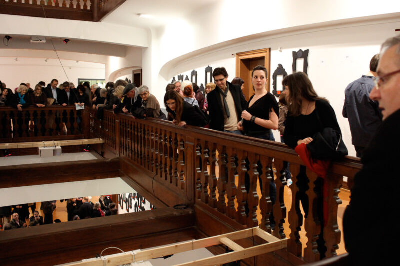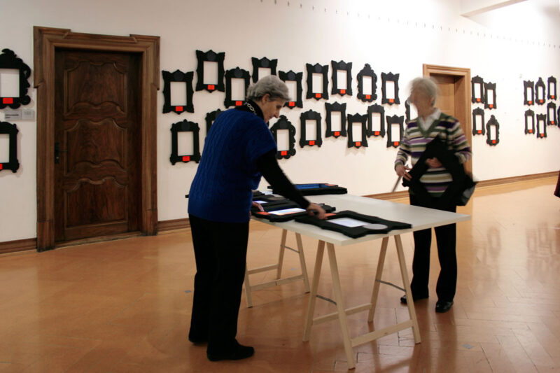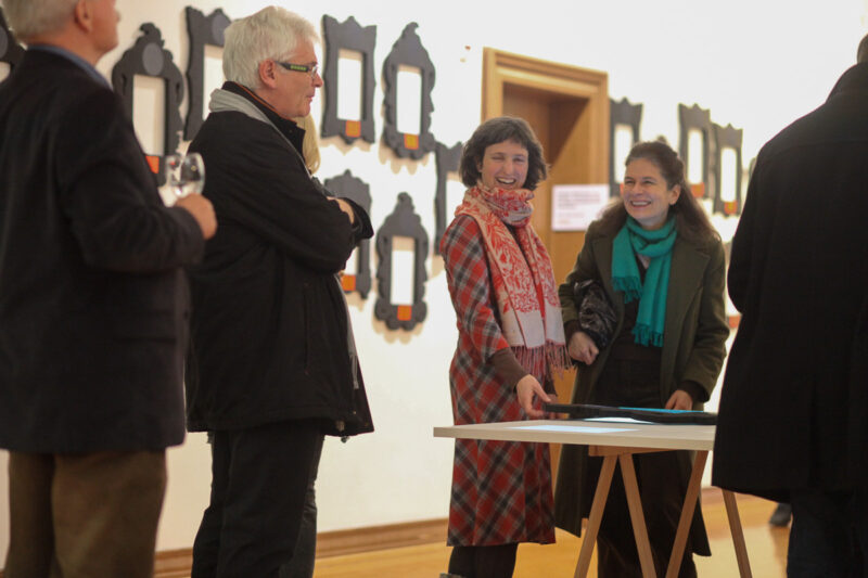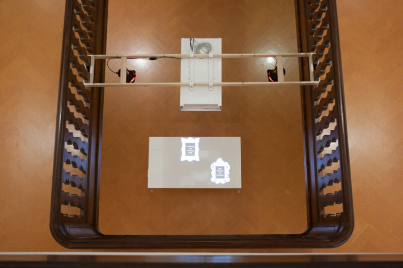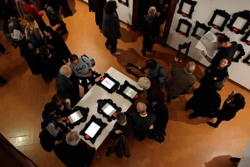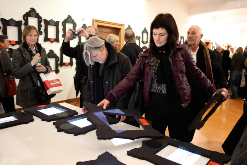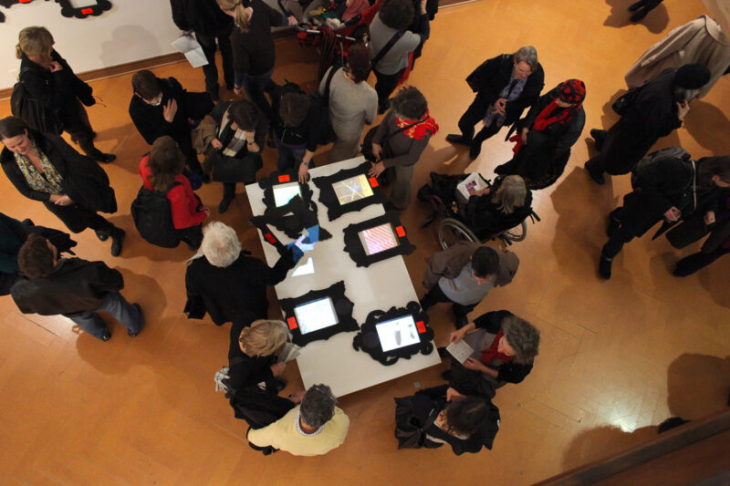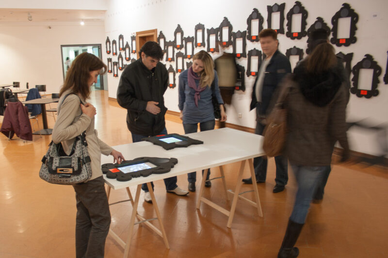 Leere Bilderrahmen an der Wand sind mit Name, Ort und Nummer des Kunstschaffenden versehen. Besucher können eine Auswahl von Rahmen auf einen von drei Tischen legen. Hier werden die Werke jetzt in den Rahmen auf dem Tisch projiziert. An einem Tisch könne mehrere Personen mit mehreren Rahmen interagieren.