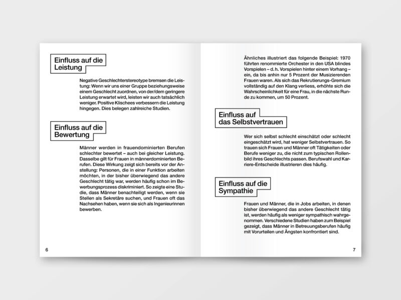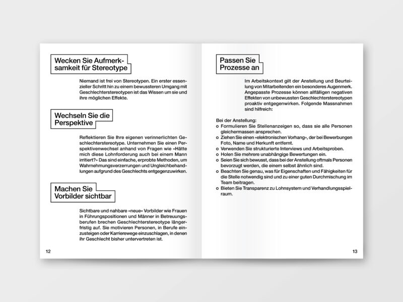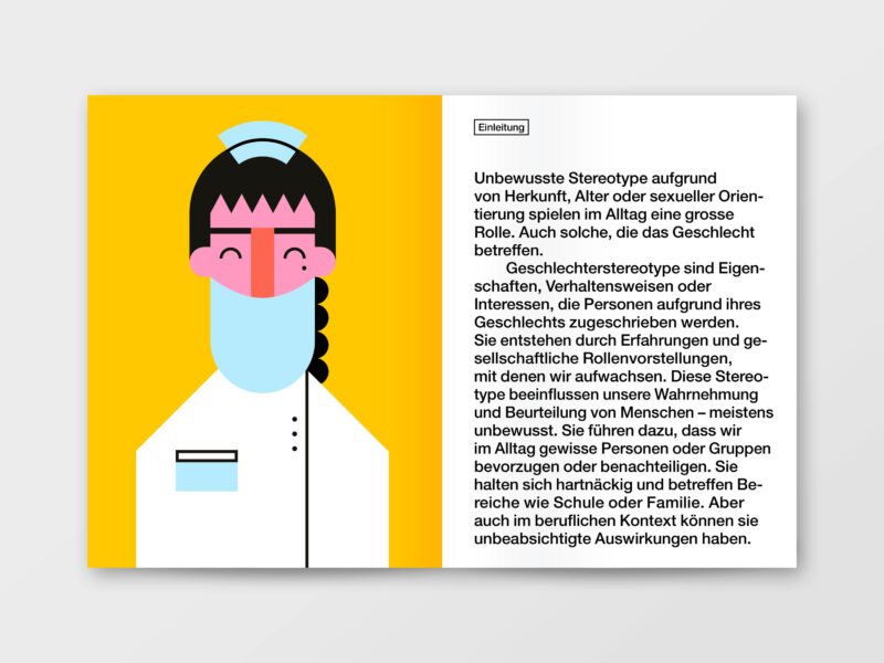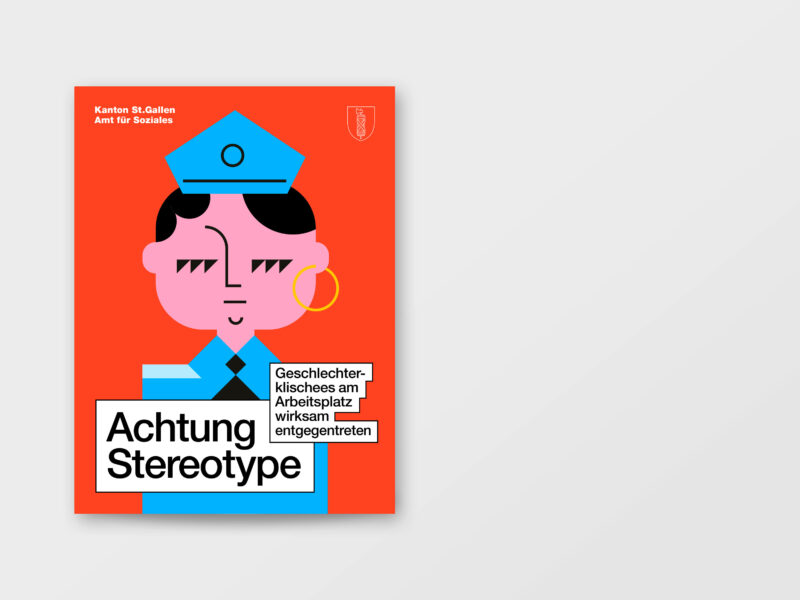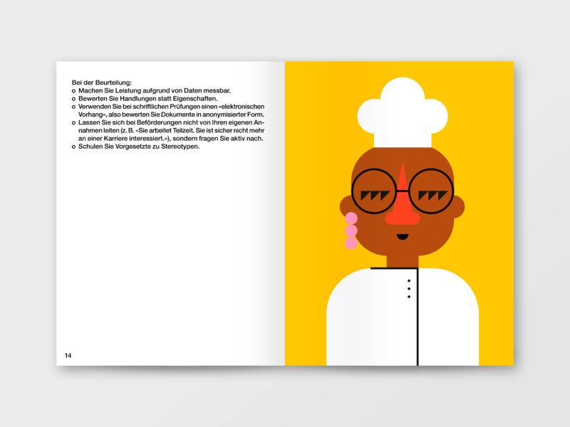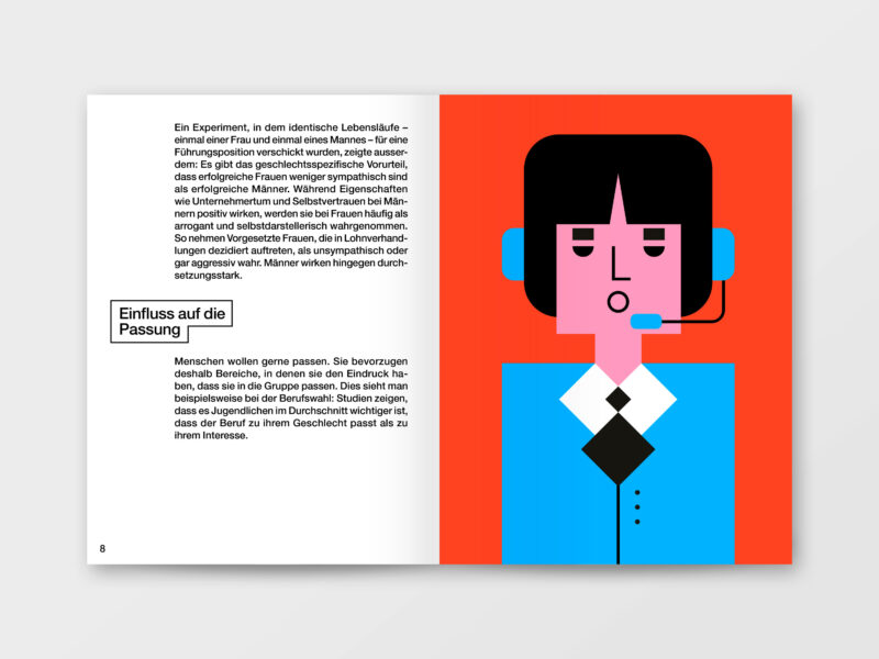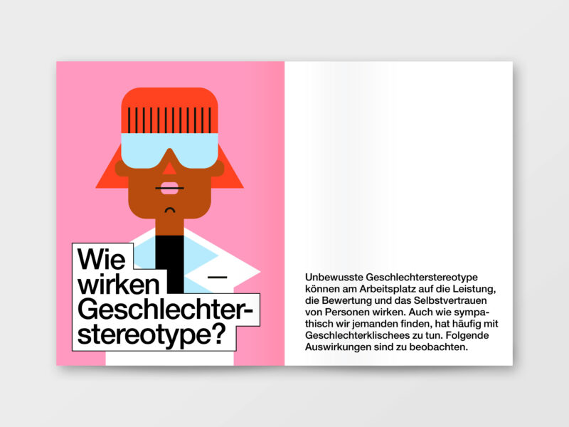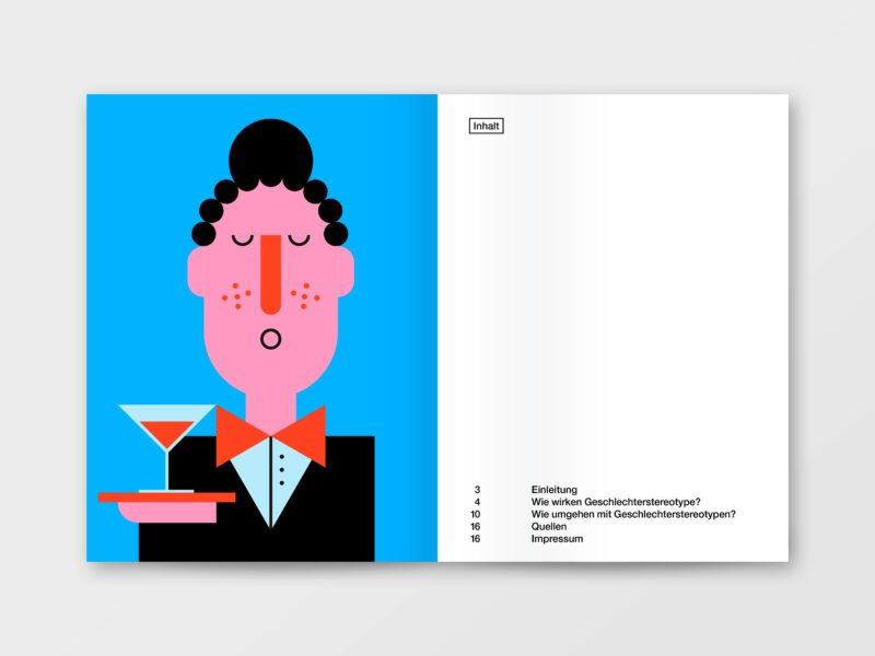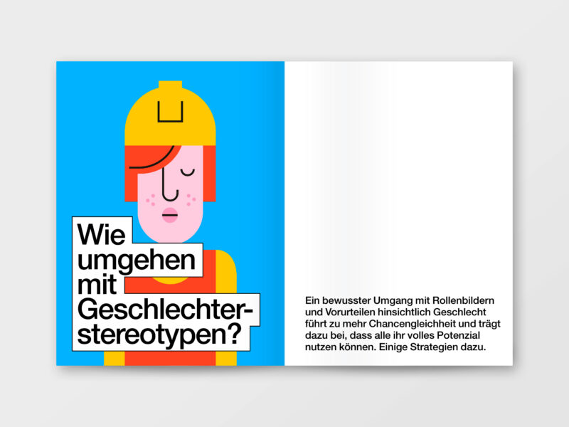 Konzept/Gestaltung: Ein handliches Booklet mit Objektcharakter, das auch Dank sorgfältiger Materialwahl und Bindung gerne aufbewahrt wird. Die stark abstrahierten Illustrationen setzen die Thematik in Szene und erweitern die Textaussage: Handelt es sich bei den Protagonisten um Männer oder Frauen? Anhand welcher Details wird dies entschieden? Stil und Farbgebung überraschen dieser amtlichen Publikation und sorgen für Aufmerksamkeit.