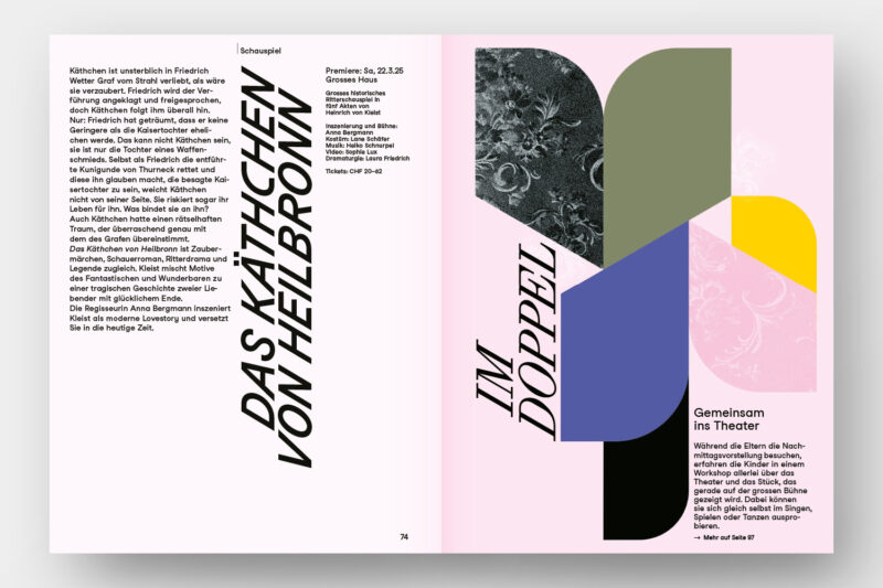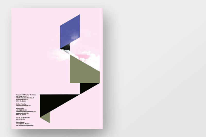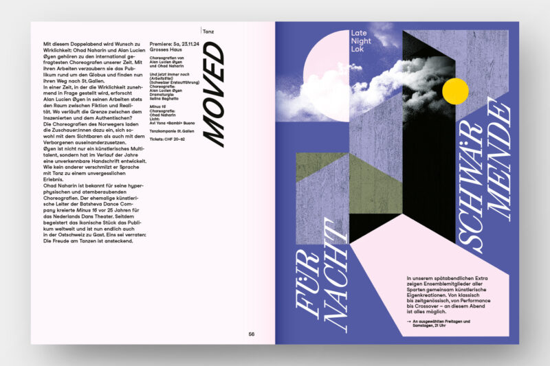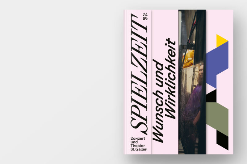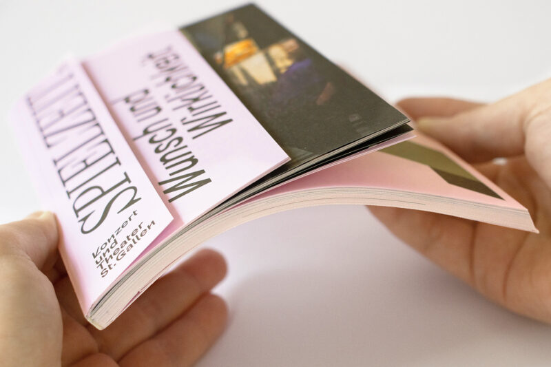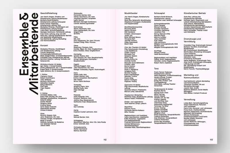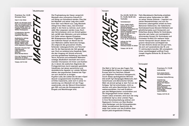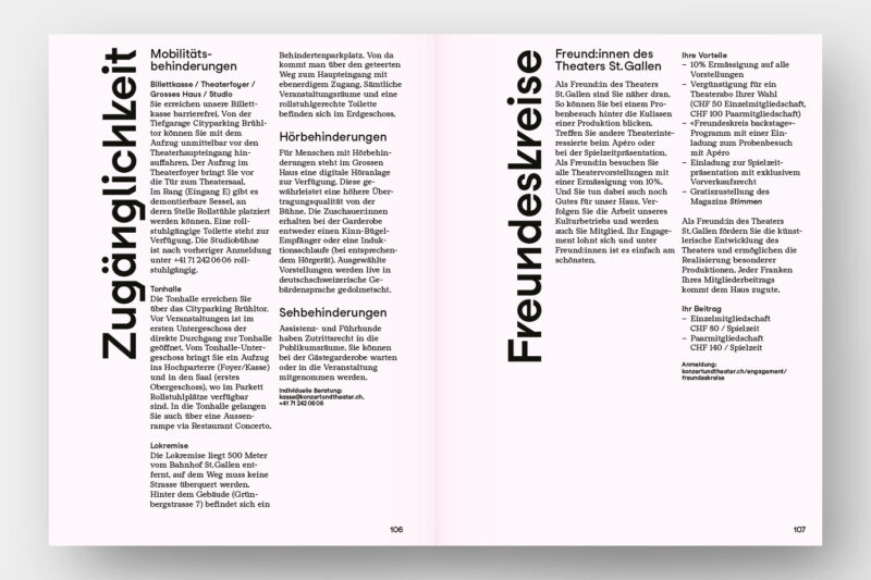 Konzept/Gestaltung: Die vier Sparten von Konzert und Theater St.Gallen – Konzert, Musiktheater, Schauspiel, Tanz – sind in der Struktur des handlichen Programmhefts zentral: Zum einen gliedern verkürzte Seiten die Broschur in vier Kapitel. Zum anderen baut das Layout auf vier Spalten auf: Die Werktitel stehen in der jeweils den Sparten zugeordneten Spalte, wodurch ein dynamisches Layout entsteht.