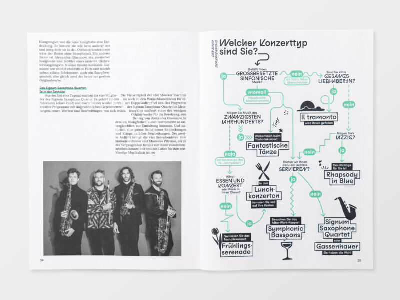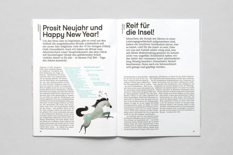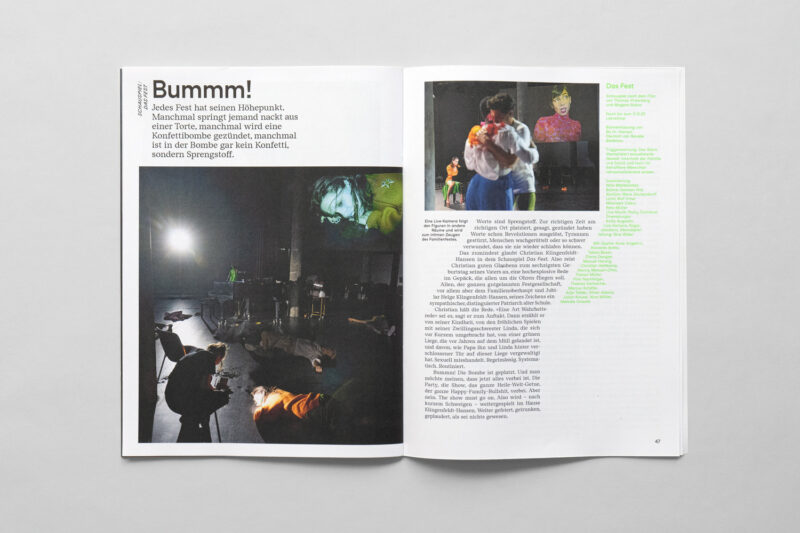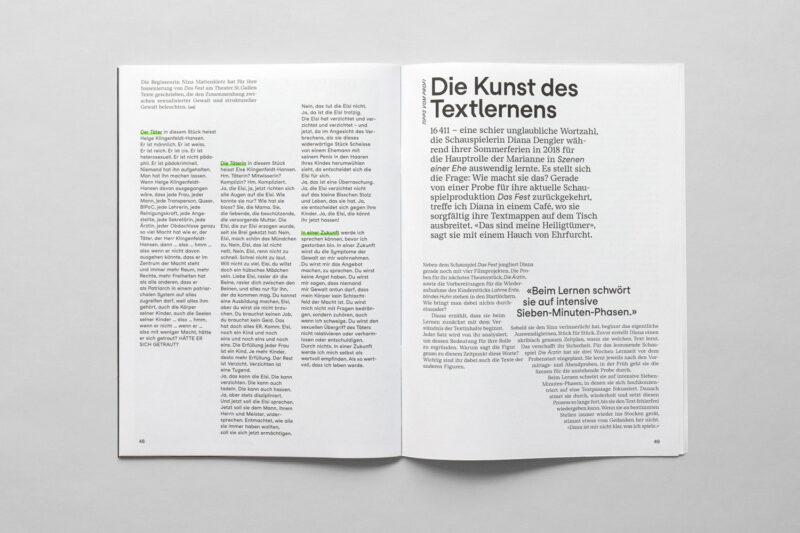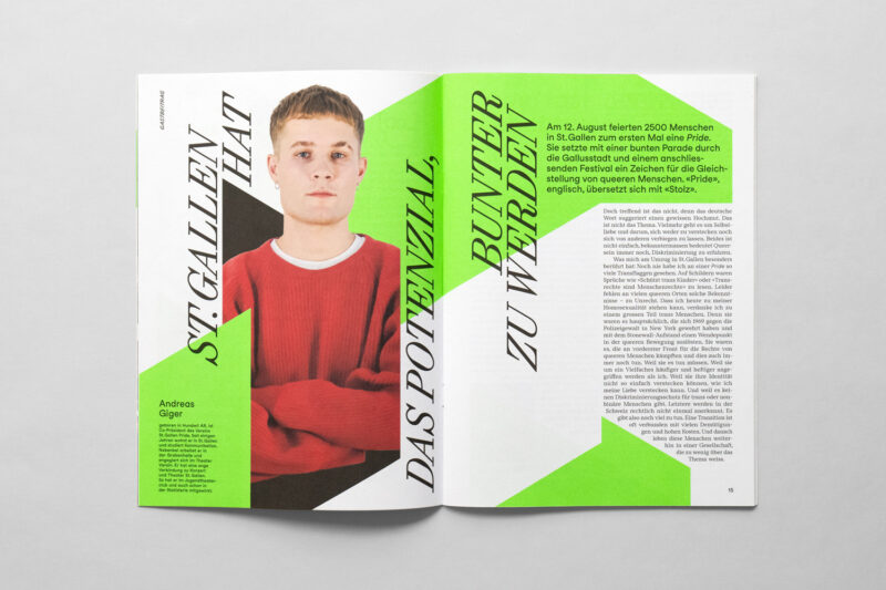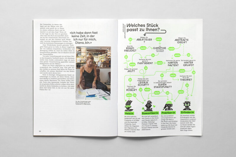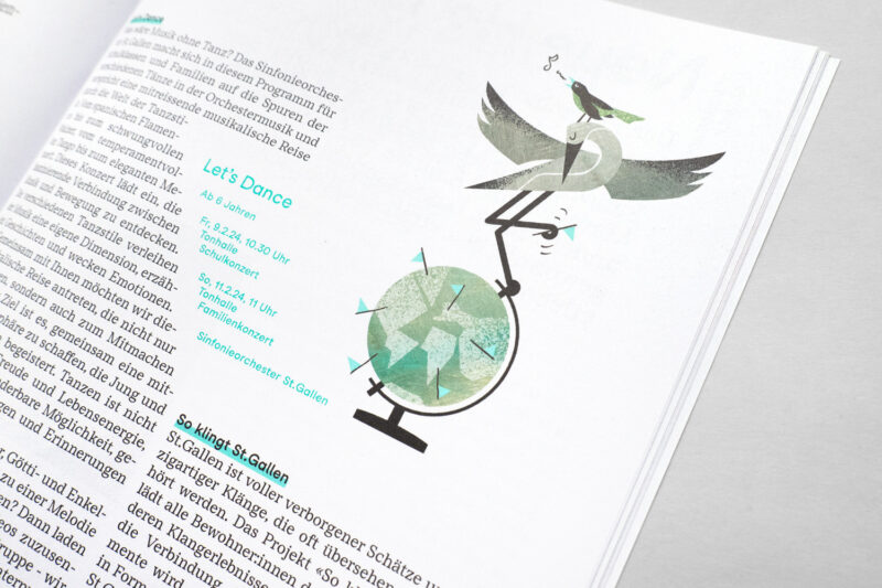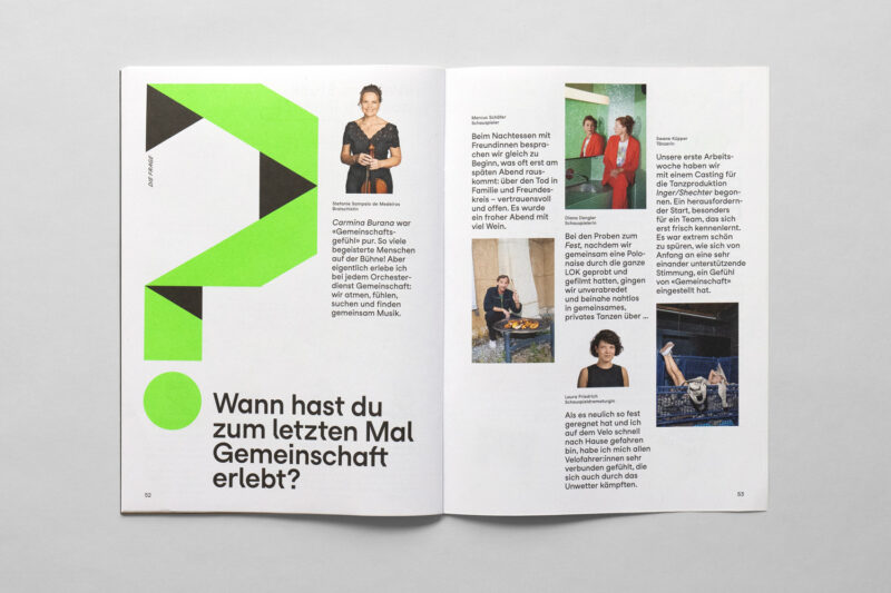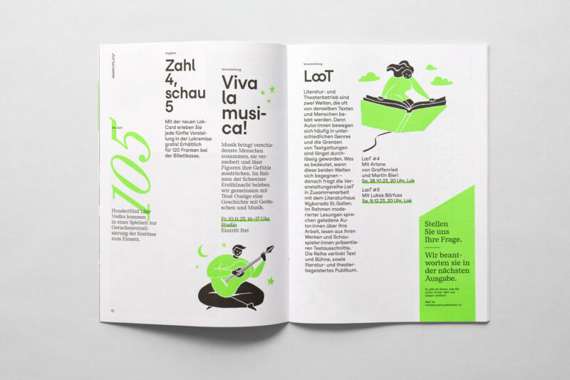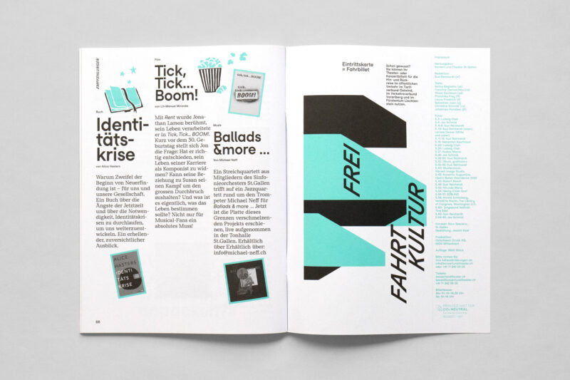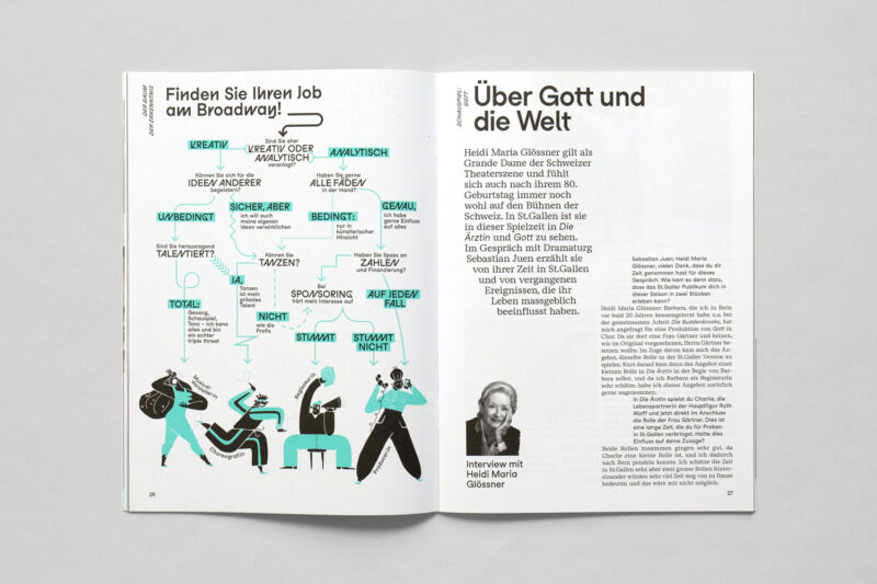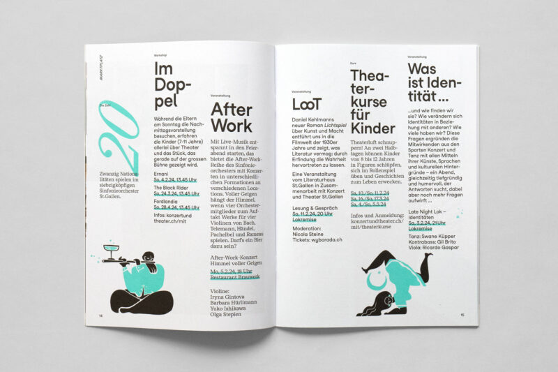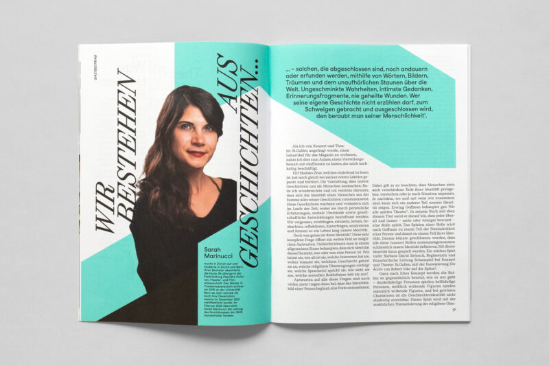 Ausgangslage: Im Zuge der Neuentwicklung des Auftritts für Konzert und Theater St.Gallen wurden diverse Drucksachen konzipiert, darunter ein vierteljährlich erscheinendes Magazin.