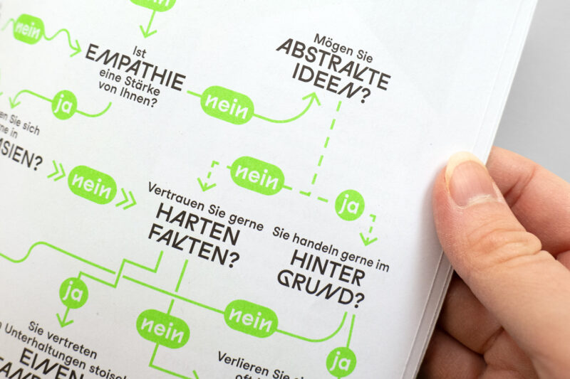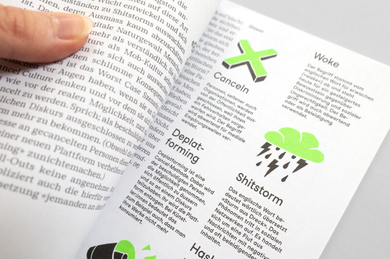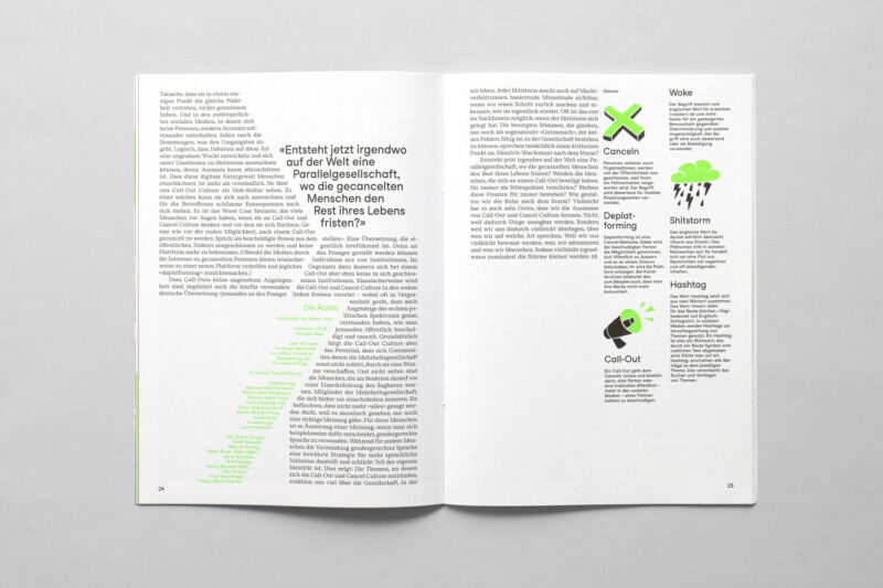 Medium: Geheftetes Magazin mit verkürzter Titelseite; gedruckt mit jeweils einer zusätzlichen Sonderfarbe aus dem Saisonkonzept, wie Neongrün.