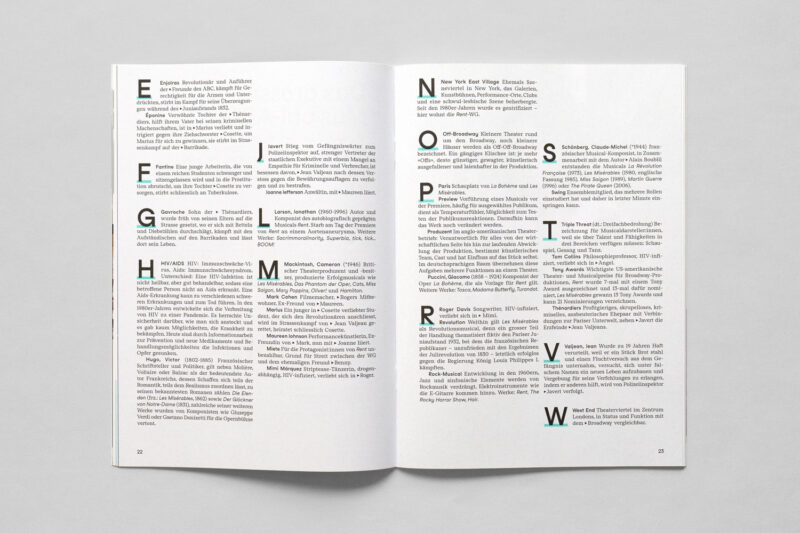 Konzept/Gestaltung: Der sechseckige, der Architektur entnommene Raster, sowie die aus den vier Sparten – Konzert, Musiktheater, Schauspiel, Tanz – beruhende vierspaltigkeit wurden aus dem gestalterischen Grundkonzept übernommen. Auch die Form- und Farbsprache verbindet zu anderen Anwendungen, wie dem Generalprogramm und der Spielzeitkampagne 23/24.