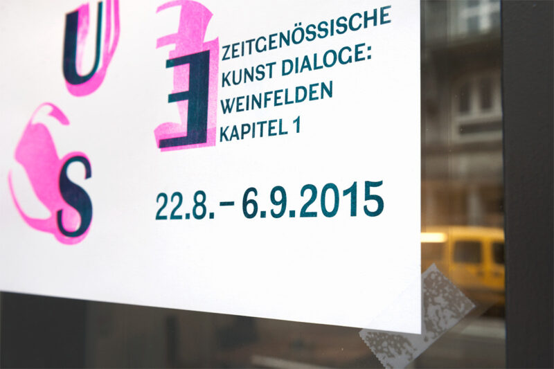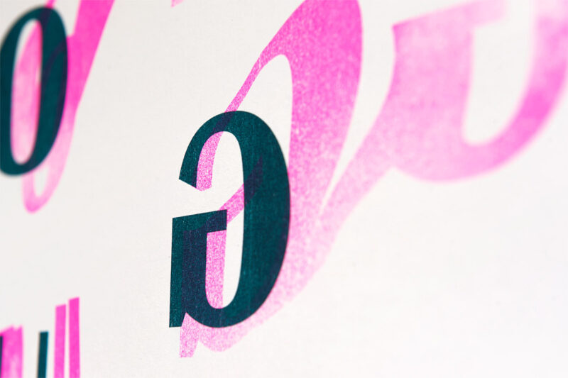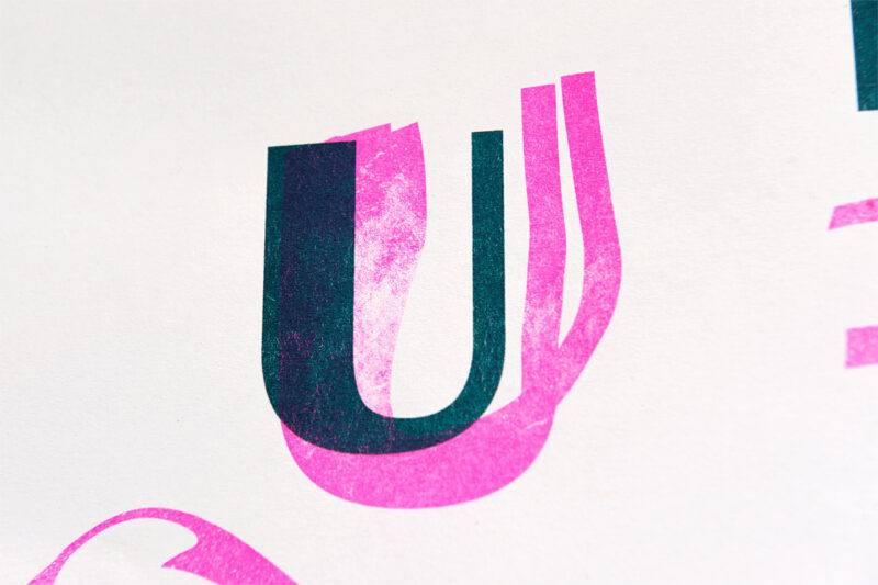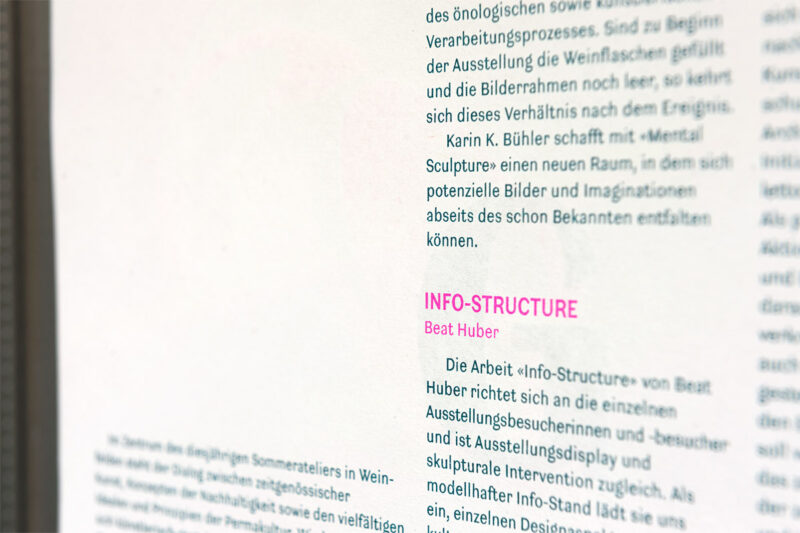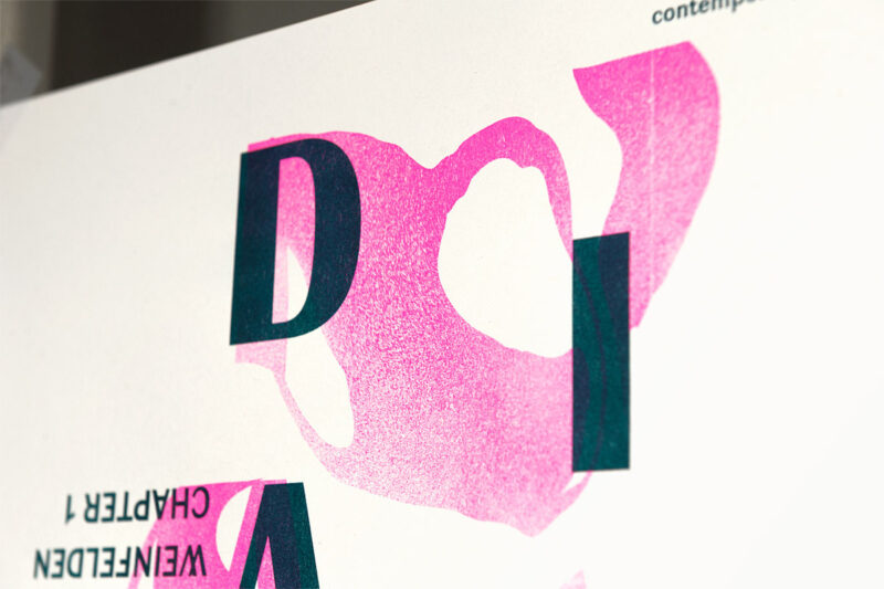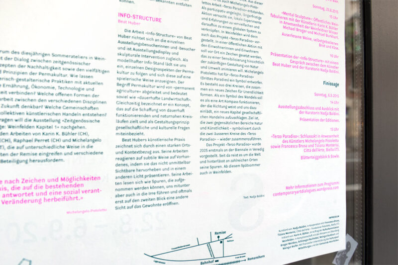 Das Kleinplakat dient gefaltet als Ausstellungsprogramm und Flyer. Die Typografie spielt mit der Darstellung von unscharfen Standpunkten während einer Debatte. Das Plakat wurde als zweifarbige Risographie-Originaldruckgrafik produziert.