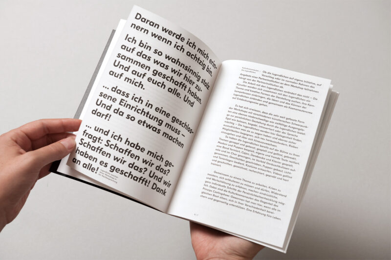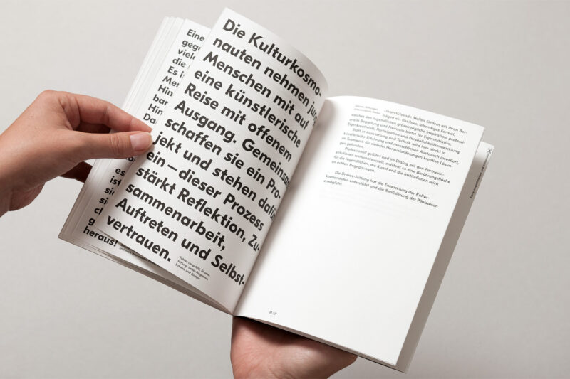 Die Broschüren stellen die Tätigkeiten der Kulturkosmonauten – einem mobilen Format von Theaterworkshops für Jugendliche – in Wort und Bild zusammenfassen dar. Grosszügig eigesetze Zitate aller Beteiligten ergänzen auf persönlicher Ebene.