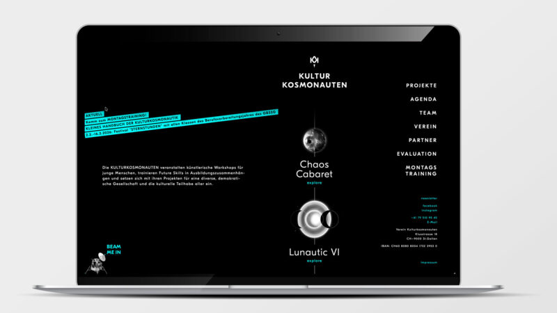 Gestaltung: Das aus zwei K bestehende Logo hebt als Rakete in den Weltraum ab. Durch die reduzierte Farbwelt und die eingenständige Bildsprache konnte eine starke, wiedererkennbare Marke etabliert werden. Die Planeten-Bildwelt wächst seit 2016 mit jedem abgeschlossenen Projekt, in dem die Beteiligten einen unbekannten Planeten «erforscht» haben.