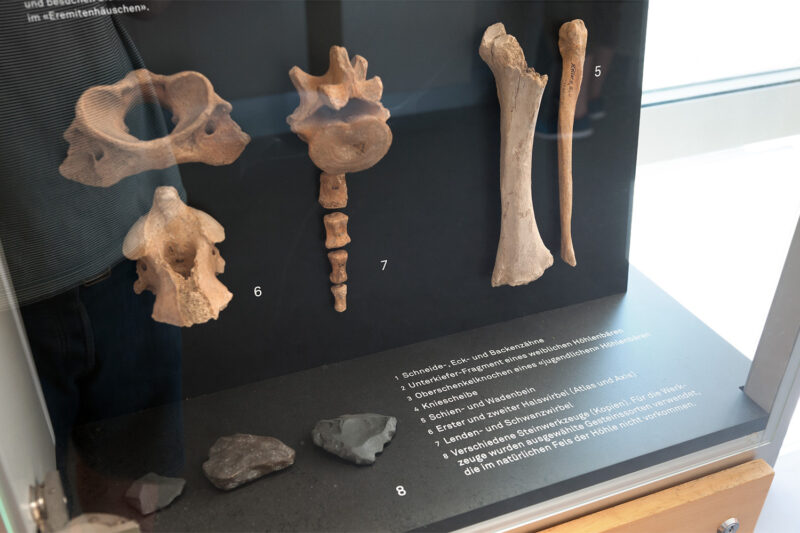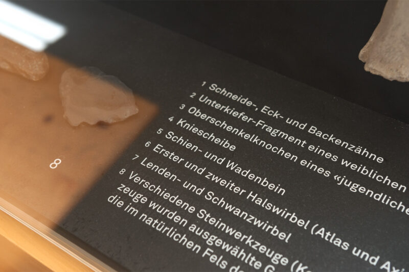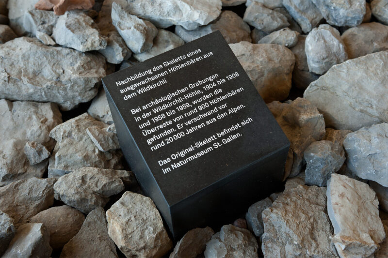 Der grössere Projektteil bestand aus der Entwicklung von robusten Wechselausstellungen für die unbeaufsichtigte Eremitenhütte (Bauten und Tourismus sowie Spuren aus der Steinzeit) und einer informativen, zurückhaltenden Besucherführung durch die Höhle.