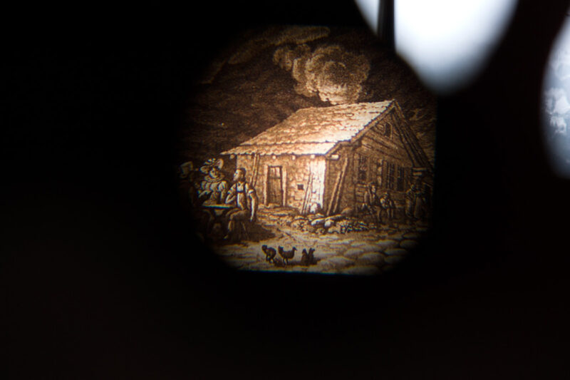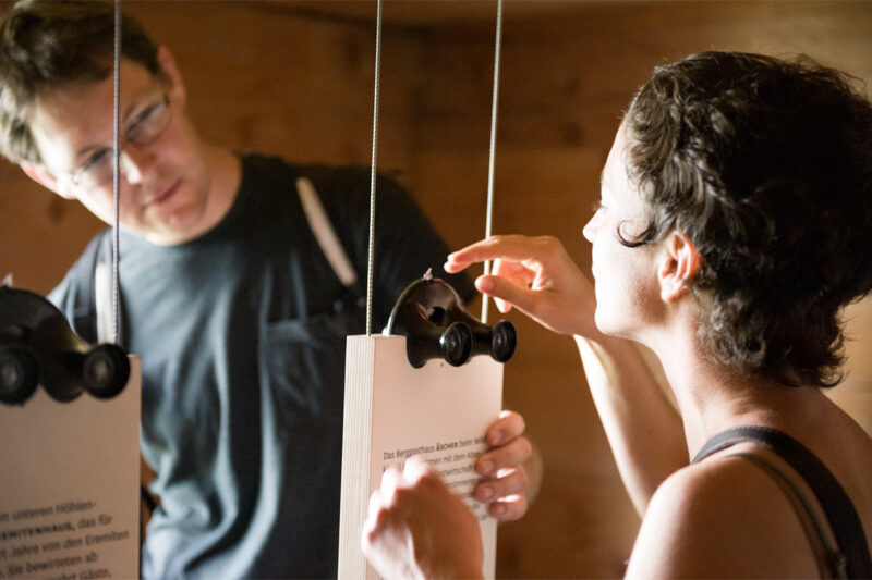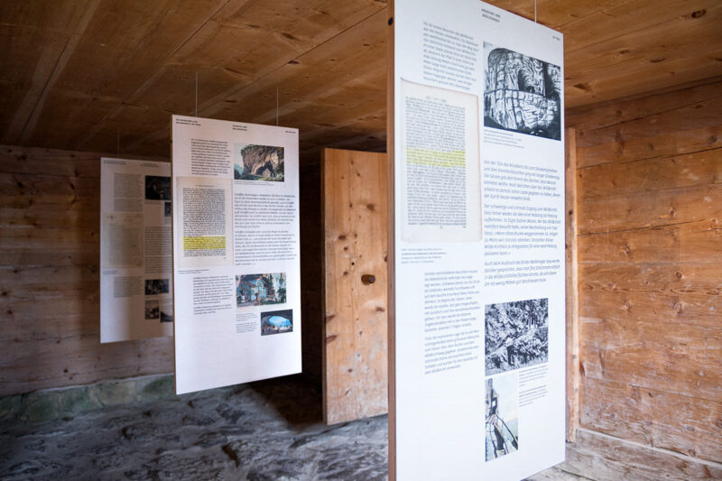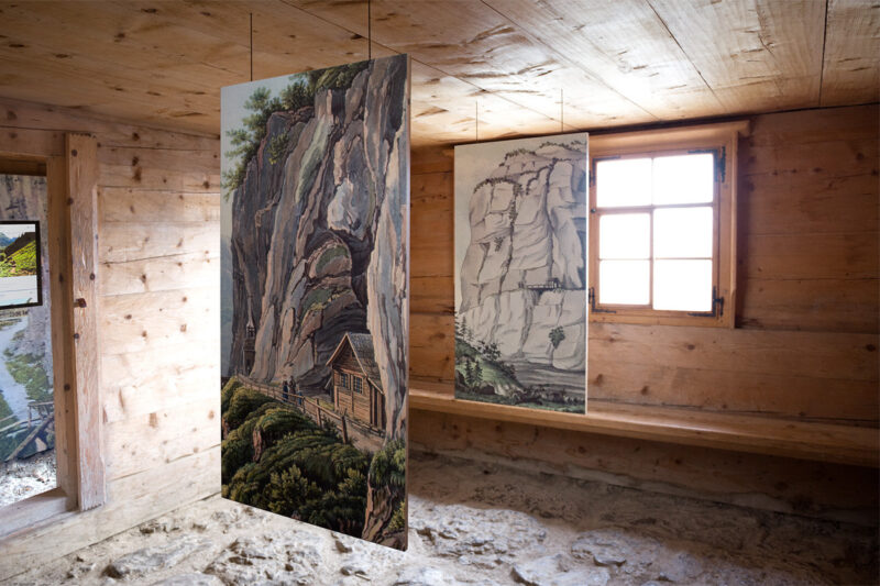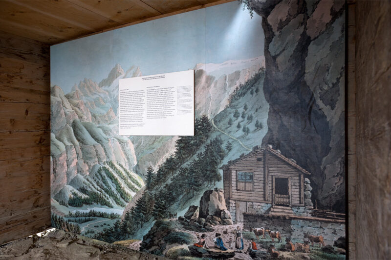 Die Ausstellung macht mit einfachsten Mitteln – ohne Kunstlicht, ohne die Alphütte zu verstellen – die Inhalte erlebbar: Bildsequenzen sind in höhenverstellbaren Stereoguckern zu entdecken. Drei hängende Tafeln erzählten Geschichten zu Fackelbuben, Höllabgrund und dem Besuch Joseph Victor von Scheffels.