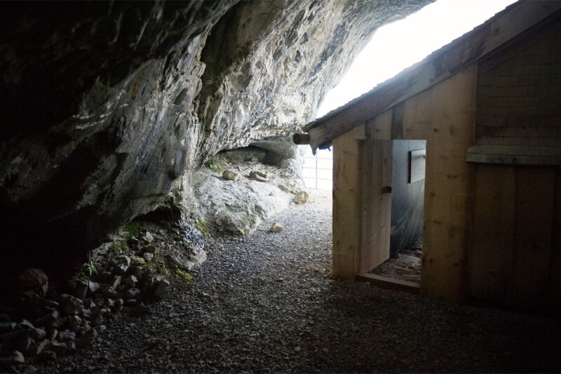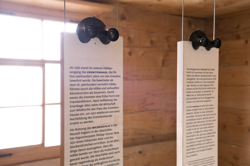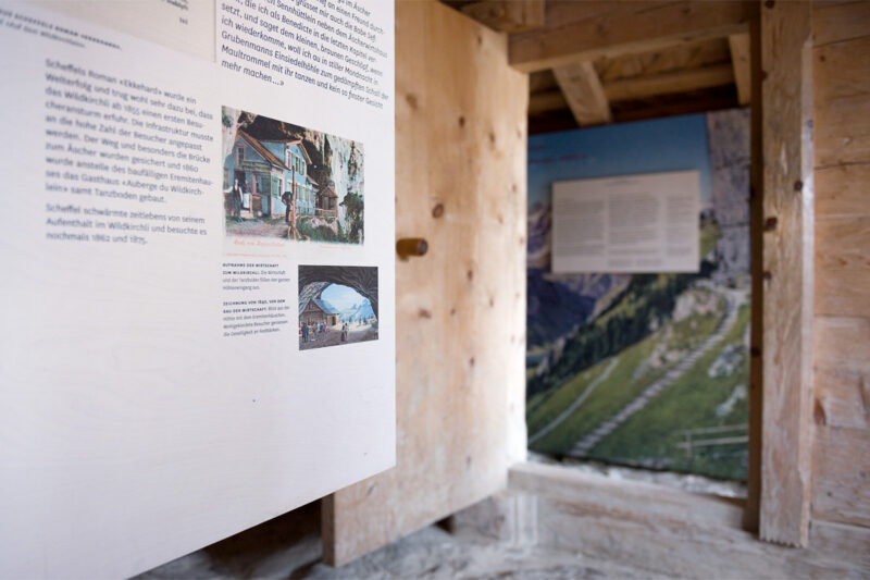 Ergänzend zur Ausstellung in der Wildkirchlihöhle und der Berg- und Talstation der Luftseilbahn, wird die Eremitenhütte mit Wechselausstellungen bespielt. Robust gebaut und modern gestaltet vertiefen sie spannende Aspekte rund um das Wildkirchli. Die Thematik Bauten und Tourismus macht beispielsweise sichtbar, wie die Bauten und die Höhle im Laufe der Zeit verschiedenen Bedürfnissen angepasst wurde.
