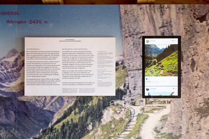 Die neusten baulichen Massnahmen wurden thematisiert, sowie die Tradition, das Sujet «Wildkirchli-Äscher» abzubilden: Nach Zeichnungen, Stichen und Drucken, war bis vor wenigen Jahren die Postkarte omnipräsent. Heute spielt das Internet eine immer grössere Rolle: auf einem Bildschirm wurden desshalb laufend Instagram-Bilder gezeigt, die mit #aescher oder #wildkirchli markiert waren.