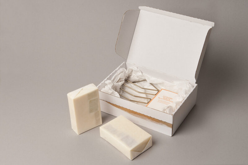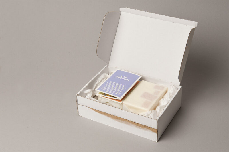 Medien/Bestandteile: Drei Seifenstücke mit individueller Beschriftung, Leporello mit Projektbeschrieb und dokumentarischen Fotografien, Versandschachtel mit Füllmaterial und individuellen Adressetiketten.