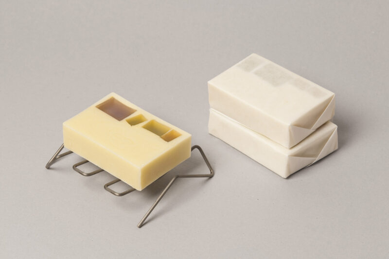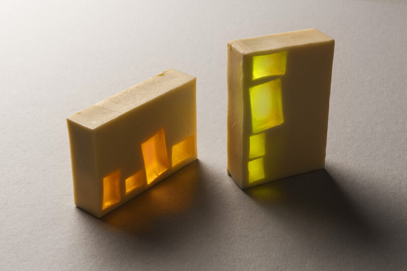 Konzept/Gestaltung: Transparente Seifenstücke in unterschiedlichen Pastelltönen werden in opake weisse Seifenmasse eingegossen. Dadurch entsteht ein Spiel zwischen Licht und Schatten sowie den kombinierten Formen. Die Düfte werden zu den Pastelltönen passend gewählt.