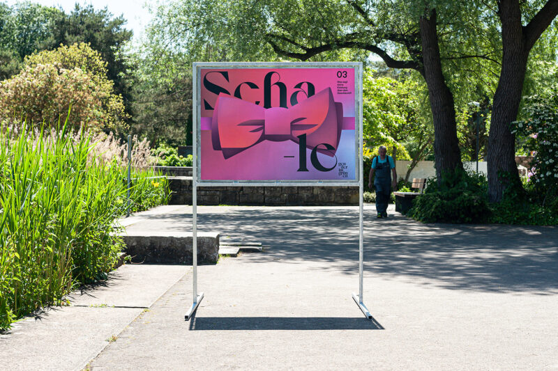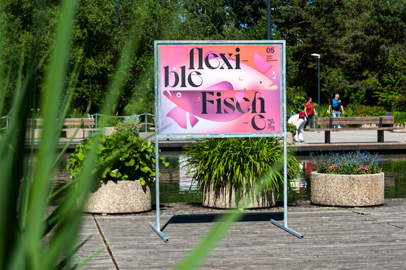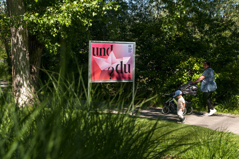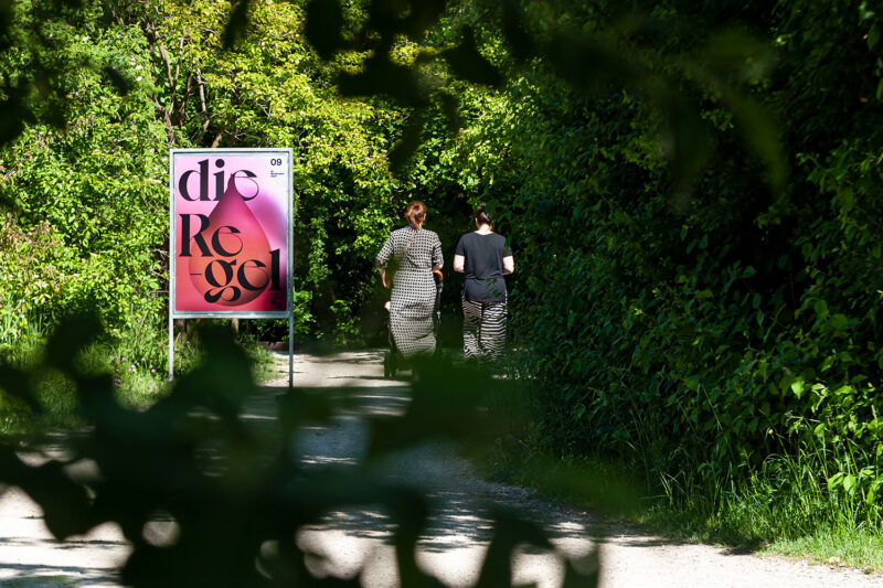 Konzept/Gestaltung: Die strategischen Plakat-Positionen erzeugen einen losen Bezug zwischen jeweiliger Themakik und der nahen Umgebung. Illustrationen mit Fernwirkung machen neugierig und ermöglichen einen lockeren, direkten Einstieg. Die Farbgebung kontrastiert mit dem grünen Umfeld.