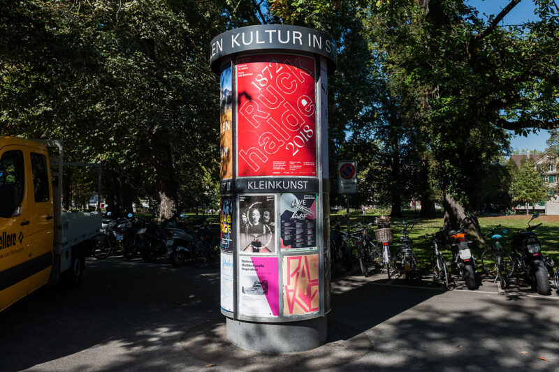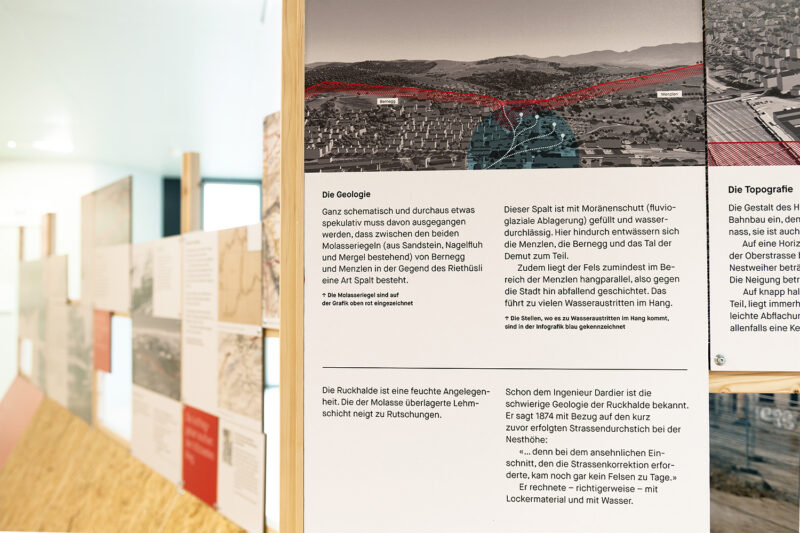 Konzept/Gestaltung: Die Form der Ausstellungswände geht auf die topografische Besonderheit der Stadt St.Gallen ein; eine verhältnismässig enge Talsohle, welche steil ins appenzellische Hügelland übergeht. Auch die Gestaltung der Kommunikationsmittel greift diese Thematik auf.