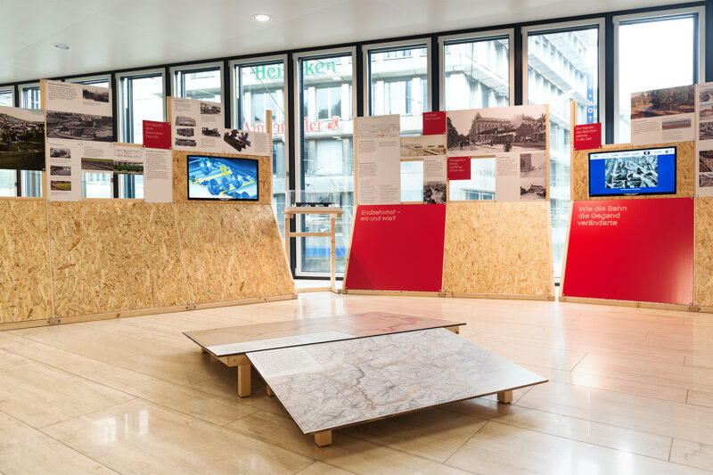 Die Einzelelemente können flexibel angeordet werden; als Tallandschaft oder als thematisch abgeschlossene Stationen. Rote Titeltafeln führen die Besuchenden durch die Ausstellung.