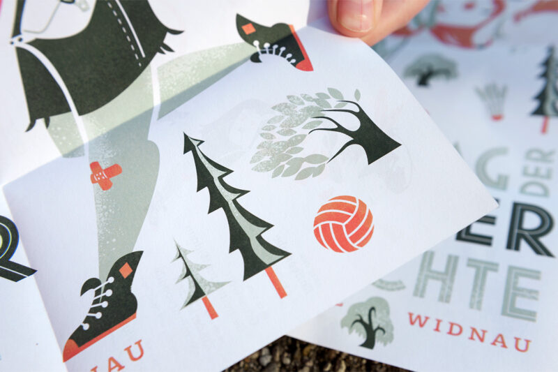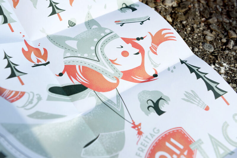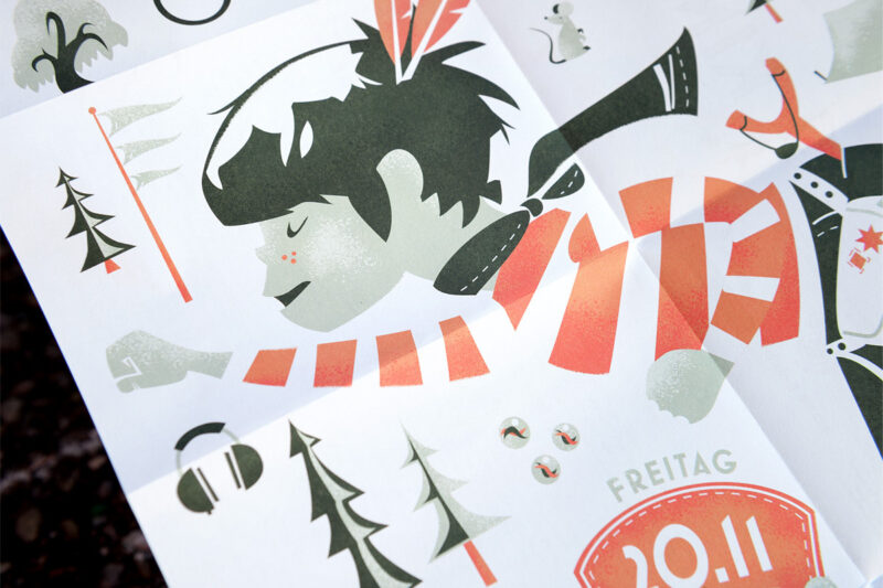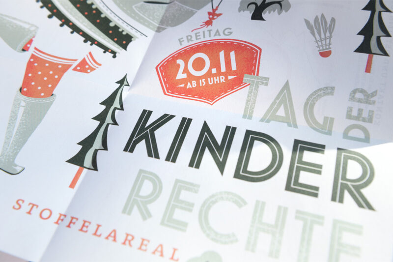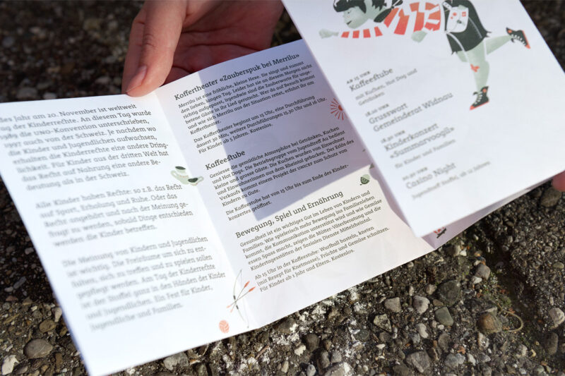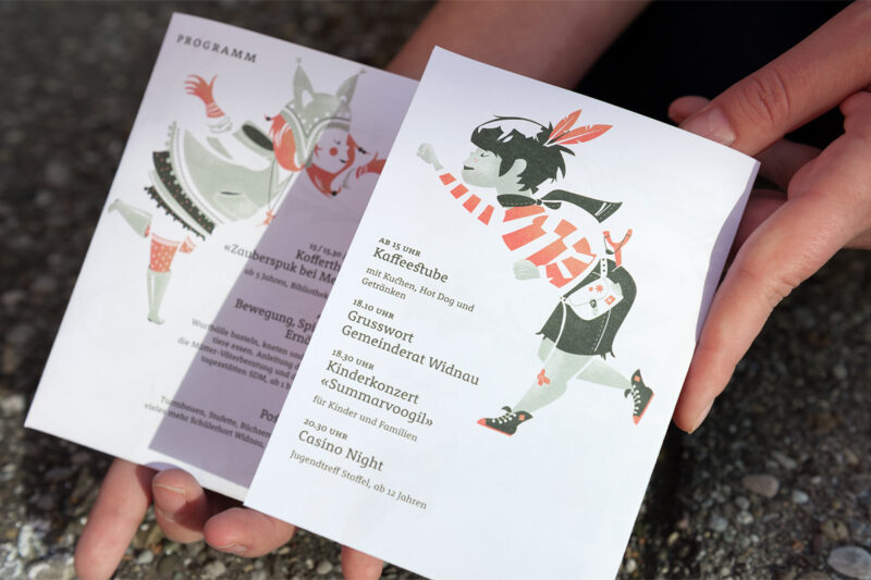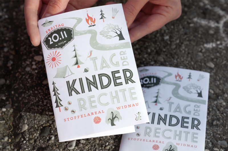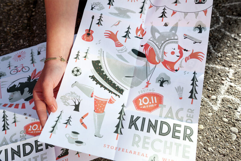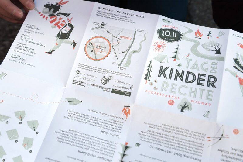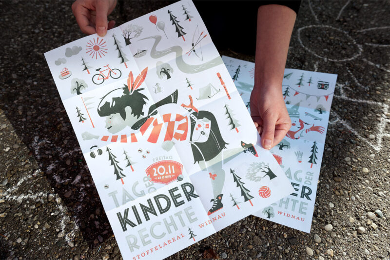 Das umfangreiche Faltprogramm für den Tag der Kinderrechte in Widnau ziert gendergerecht die eine Hälfte der Auflage ein Mädchen, die andere ein Junge in synchronen Posen. Für ein stimmiges Zusammenspiel, kann die detailstarke Plakat-Kombi nebeneinander aufgehängt werden.