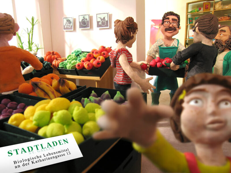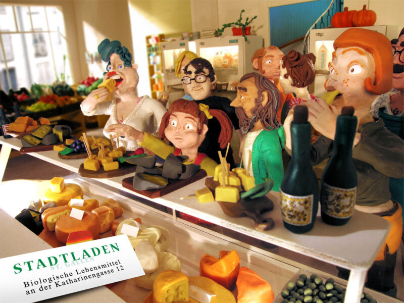 Postkarten für den Stadtladen St.Gallen, anlässlich seines 25 jährigen Bestehens: Der Laden samt Einrichtung wurde mit Modeliermasse und Papier nachgebaut. Manche Figuren – wie zum Beispiel der Gemüsebauer – wurden realen Pesonen nachempfunden.