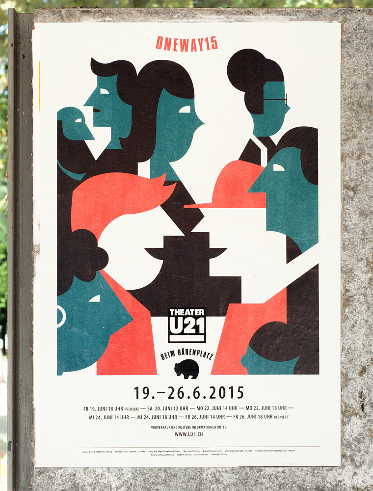 Oneway15 – Plakat für die Aufführung des Jugendtheaters U21 St.Gallen. Für U21 konnten wir auch die Plakate Picaro und Das Loch im gelben Tisch umsetzen.