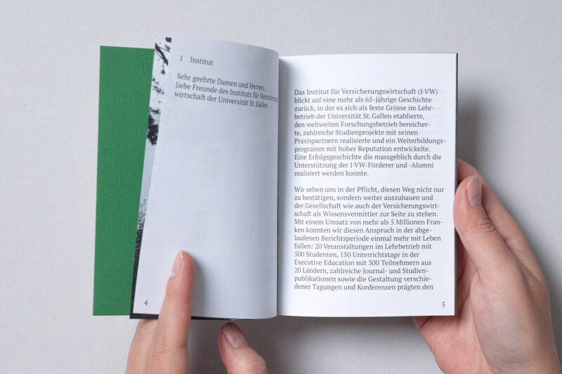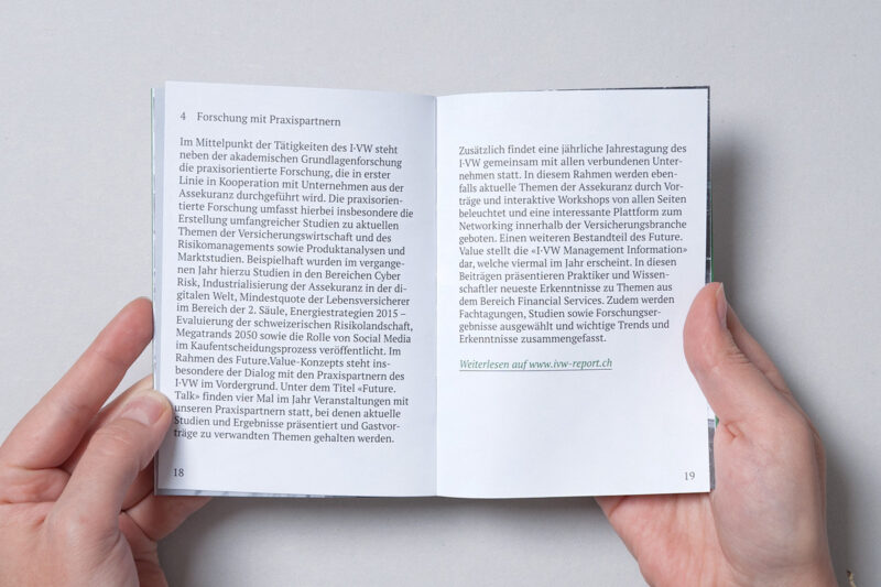 Der Jahresbericht des Instituts für Versicherungswirtschaft (I·VW) kommt als Teaser in Form einer handlichen Broschüre daher und weist auf den ausführlichen Online-Jahresbericht hin.