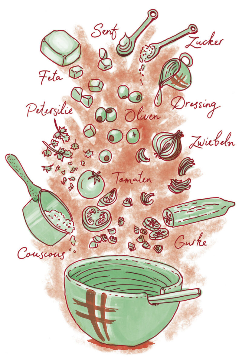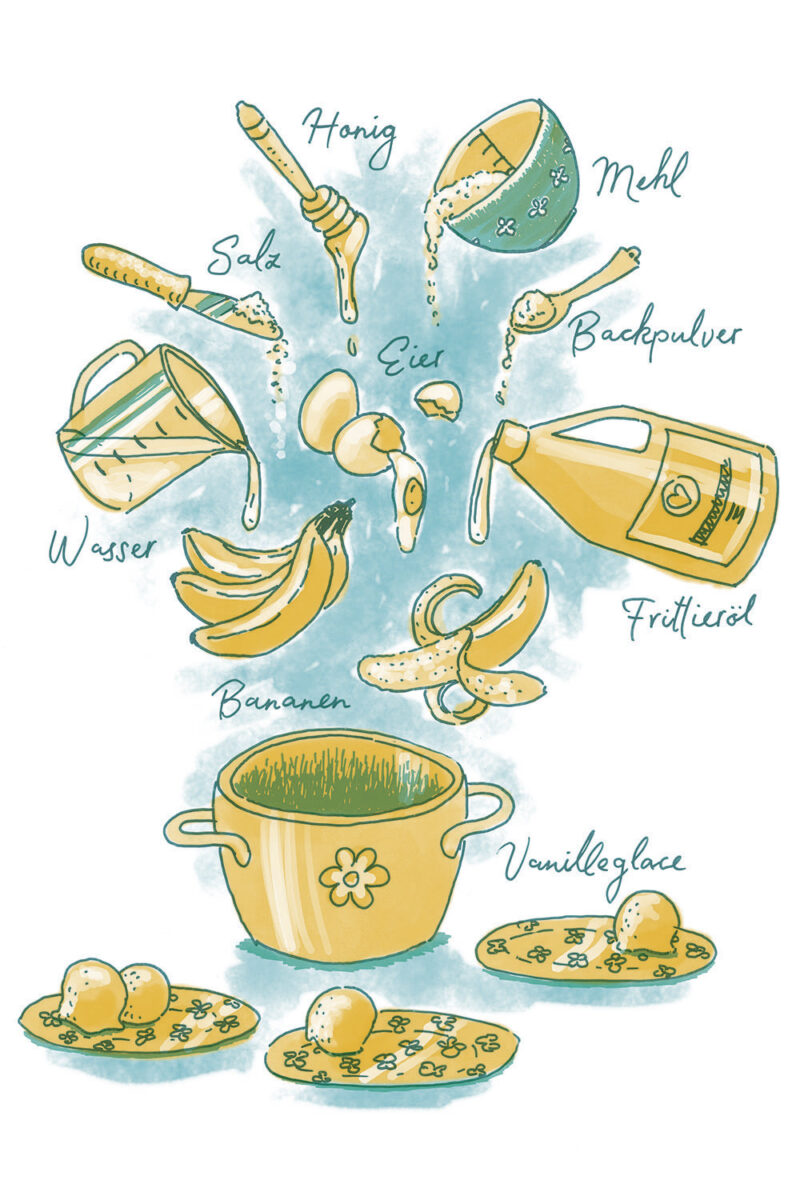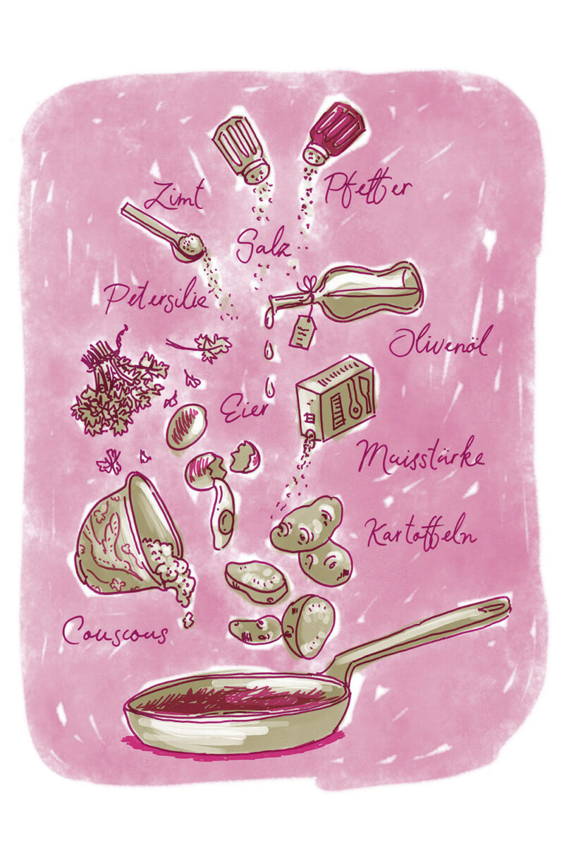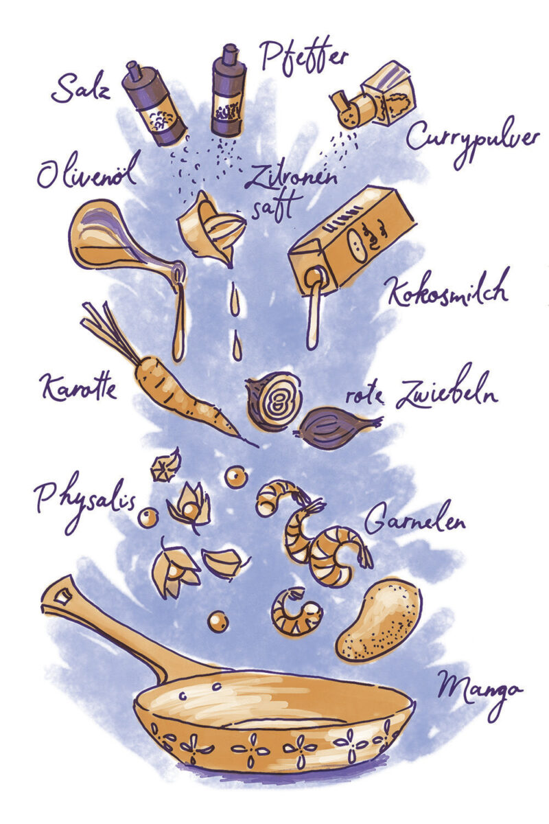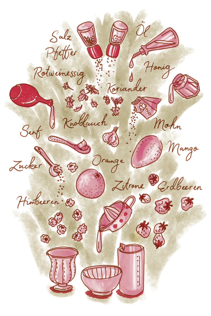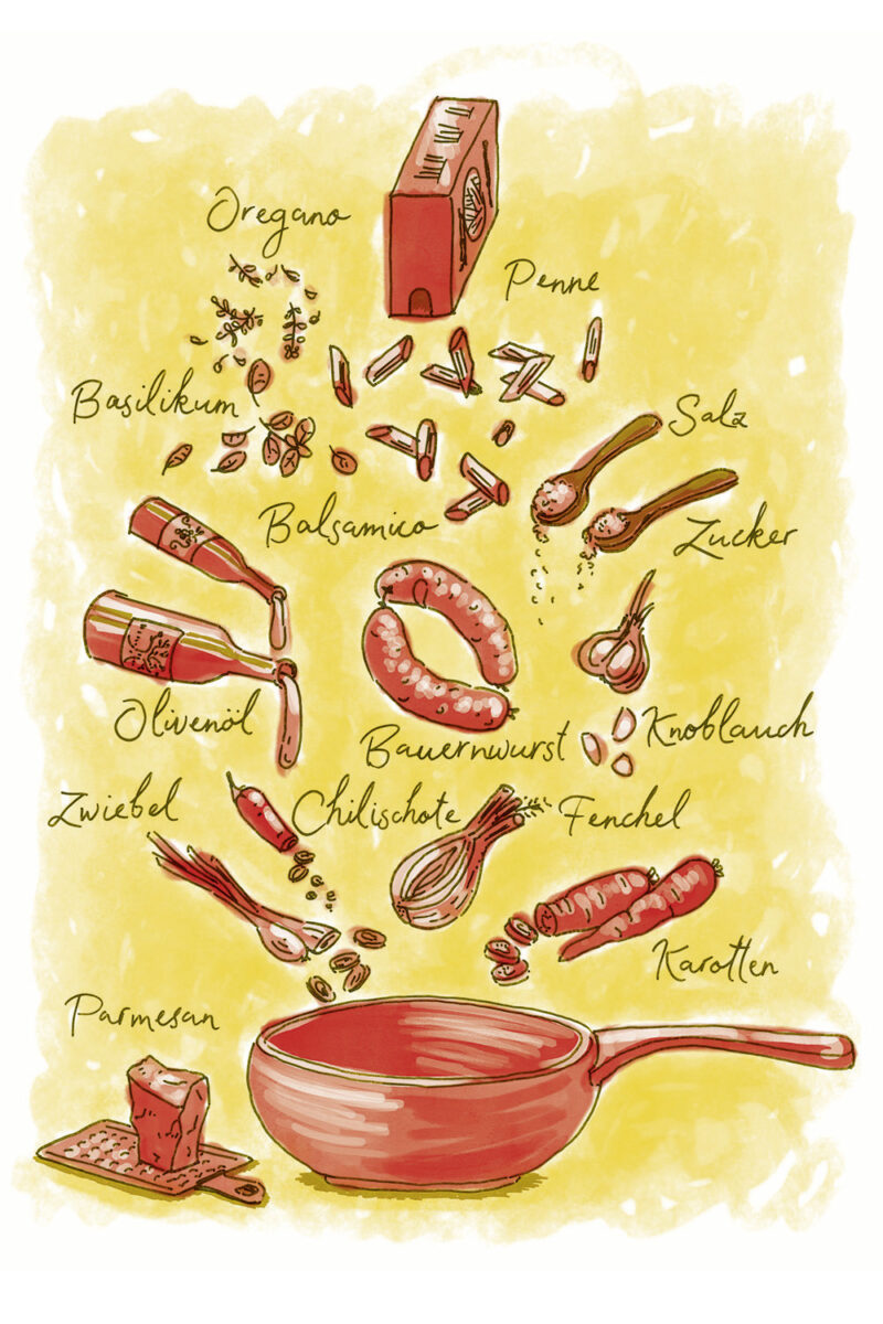 Die Illustrationen zeigen gleichzeitig eine Übersicht aller Zutaten der jeweilgen Rezepte.