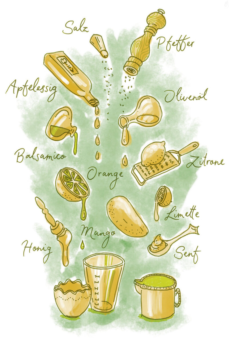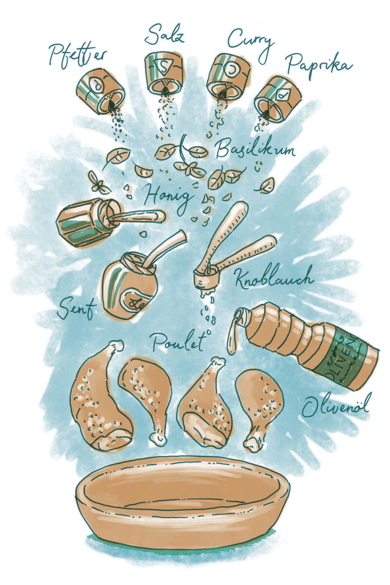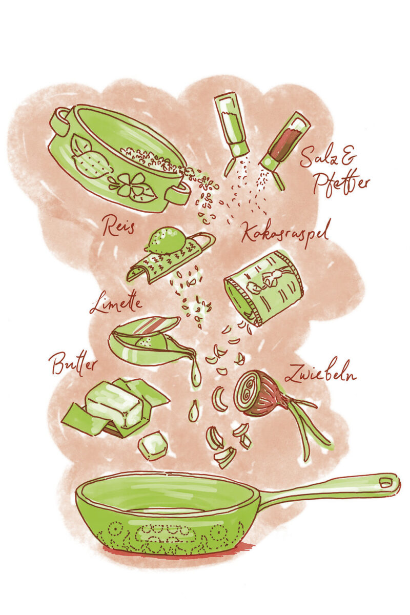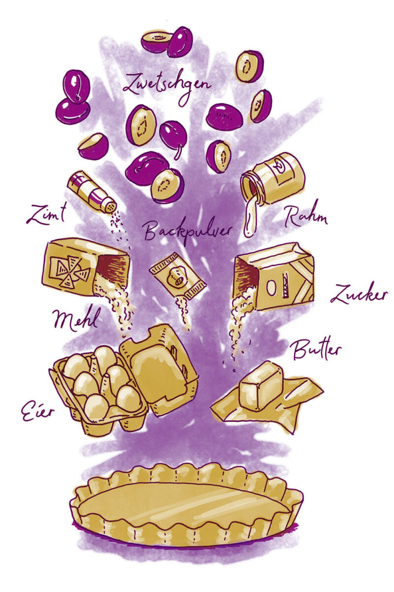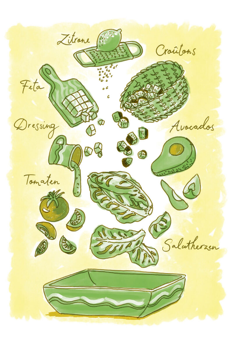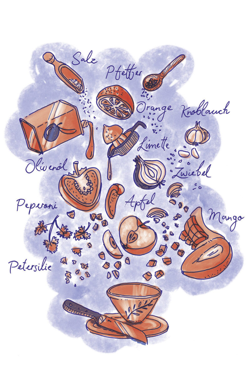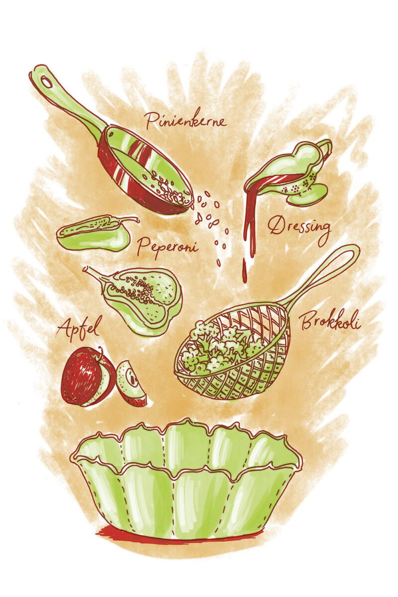 Die Illustrationen zeigen gleichzeitig eine Übersicht aller Zutaten der jeweilgen Rezepte.