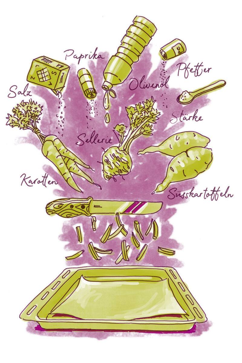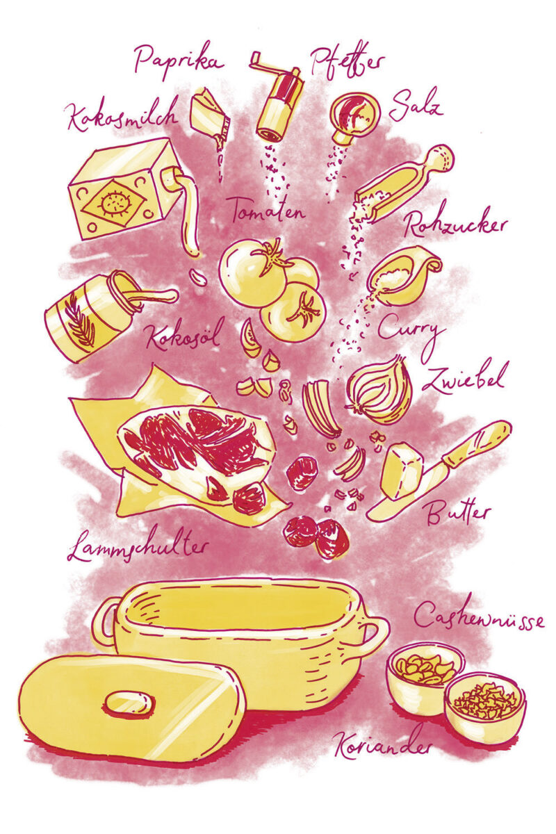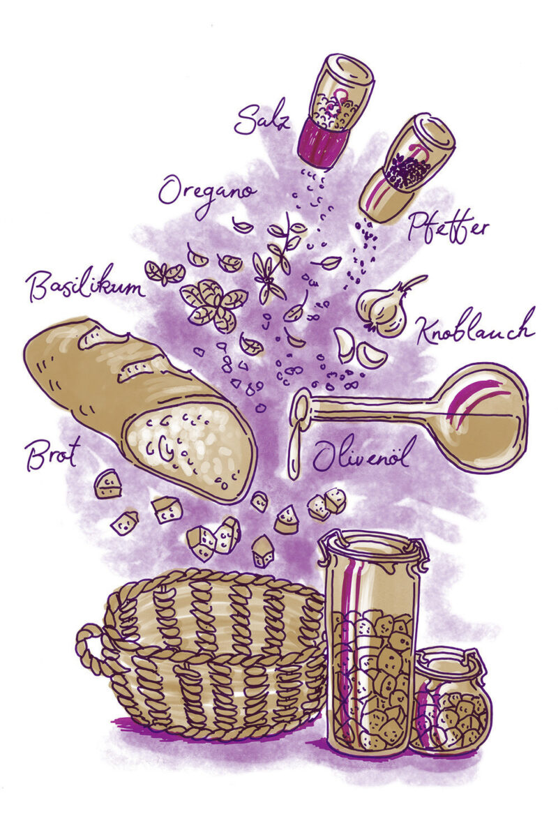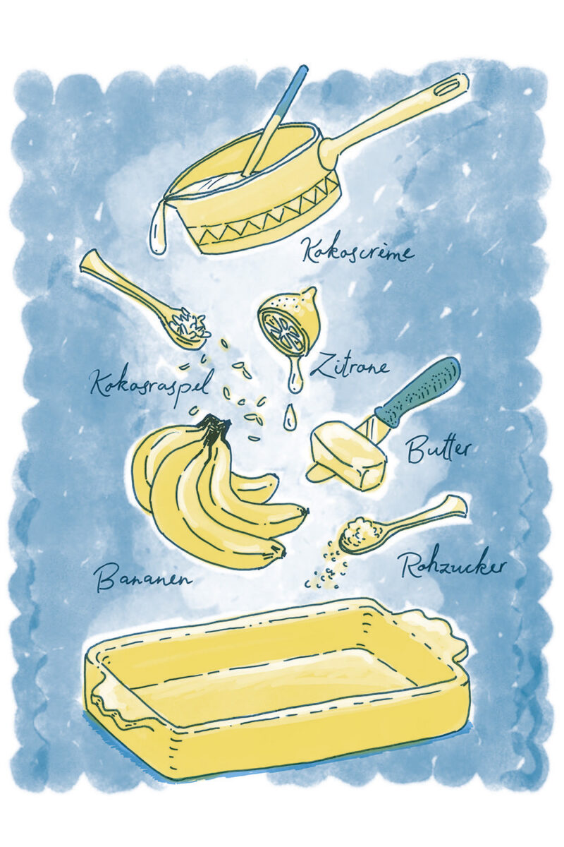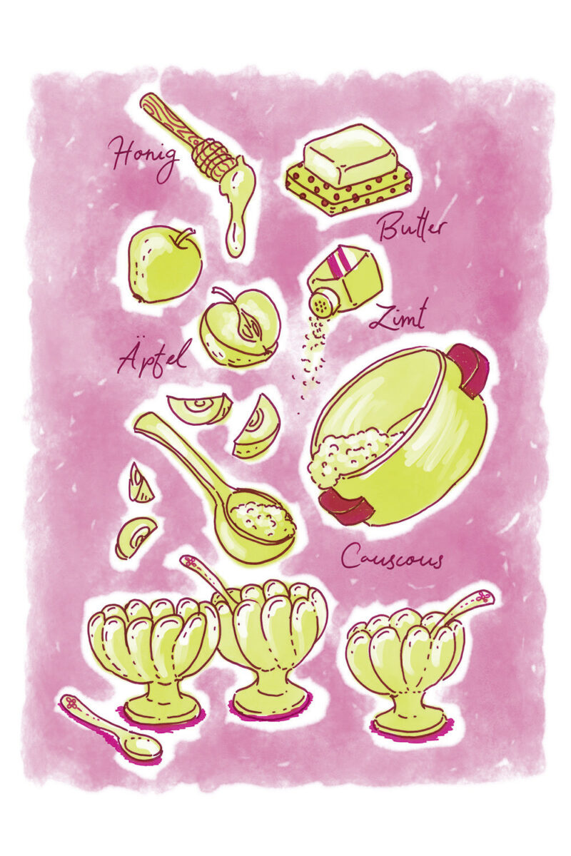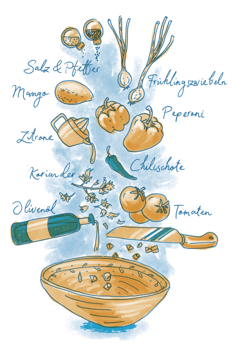 Die Illustrationen zeigen gleichzeitig eine Übersicht aller Zutaten der jeweilgen Rezepte.