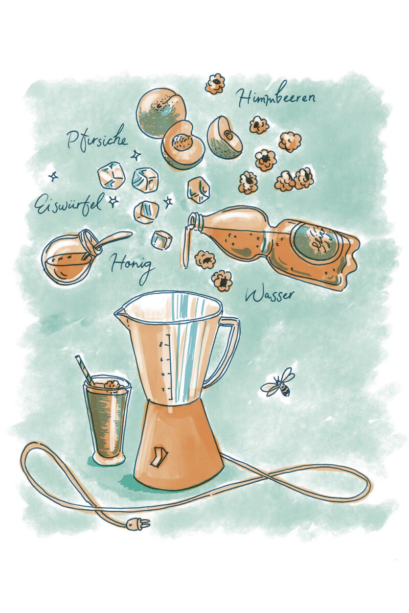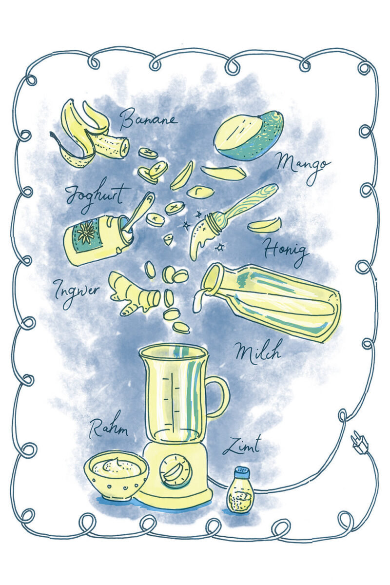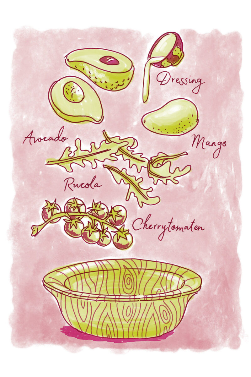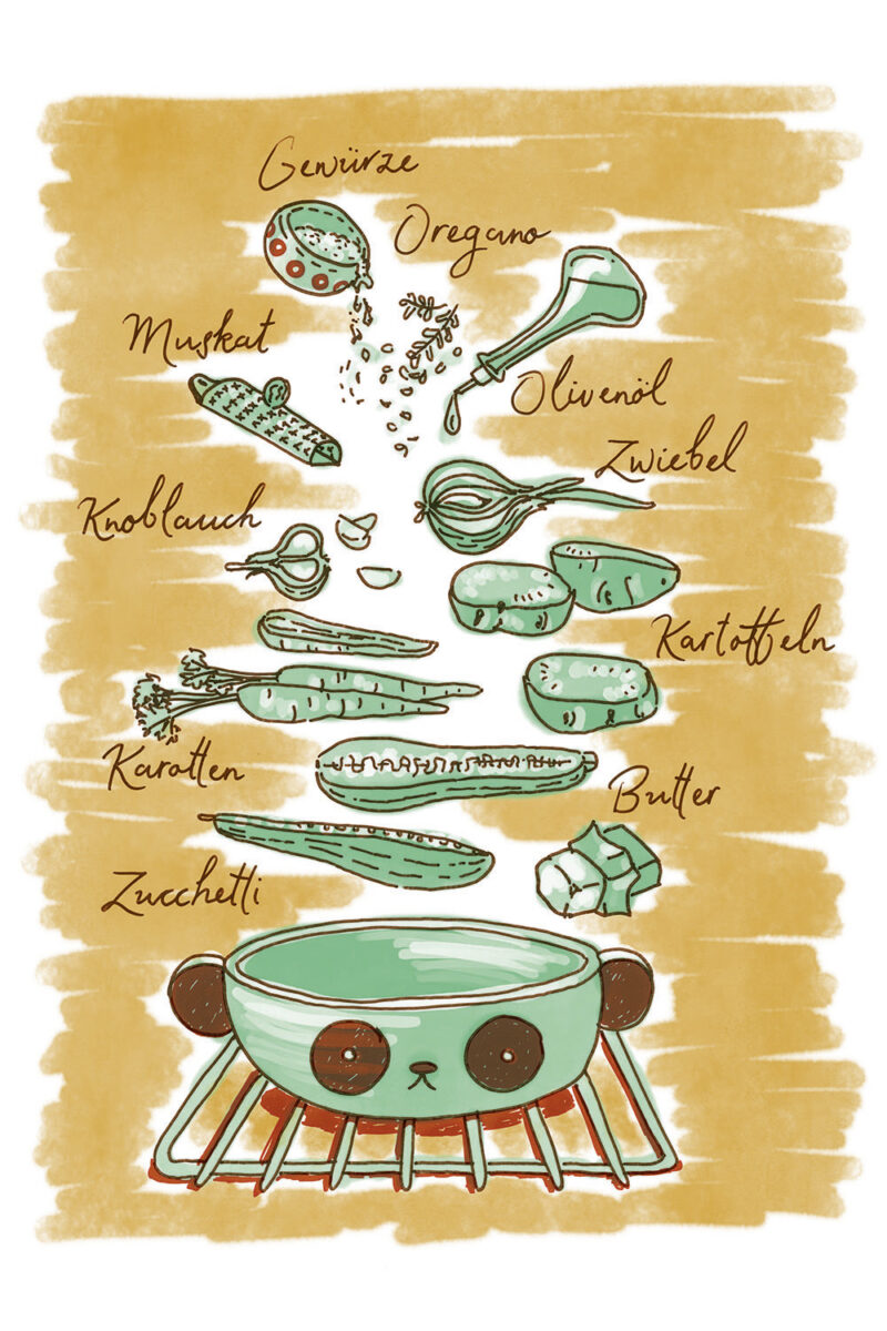 Konzept/Gestaltung: Das Herausschälen der Alleinstellungsmerkmale führte zu einem lockeren, farbenfrohen Illustrationsstil, der Lebensfreude versprüht. Er inspiriert zum Experimentieren und Festhalten eigener Ideen und Skizzen auf den leeren Farbseiten im Anschluss an die Rezeptsammlung.